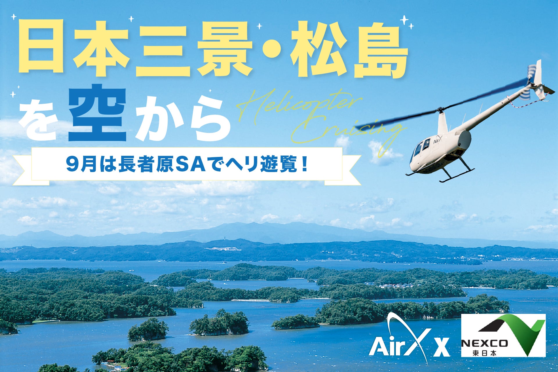 株式会社AirX(本社:東京都千代田区、代表取締役:手塚 究、以下「AirX」)は、東日本高速道路株式会社(本社:東京都千代⽥区、代表取締役:由木 文彦、以下「NEXCO東⽇本」)と連携し、東北⾃動⾞道 ⻑者原(ちょうじゃはら)サービスエリア(SA)(上り線)を離着陸地とする「ヘリコプター遊覧プラン」を8⽉1⽇(木)から販売開始することをお知らせいたします。