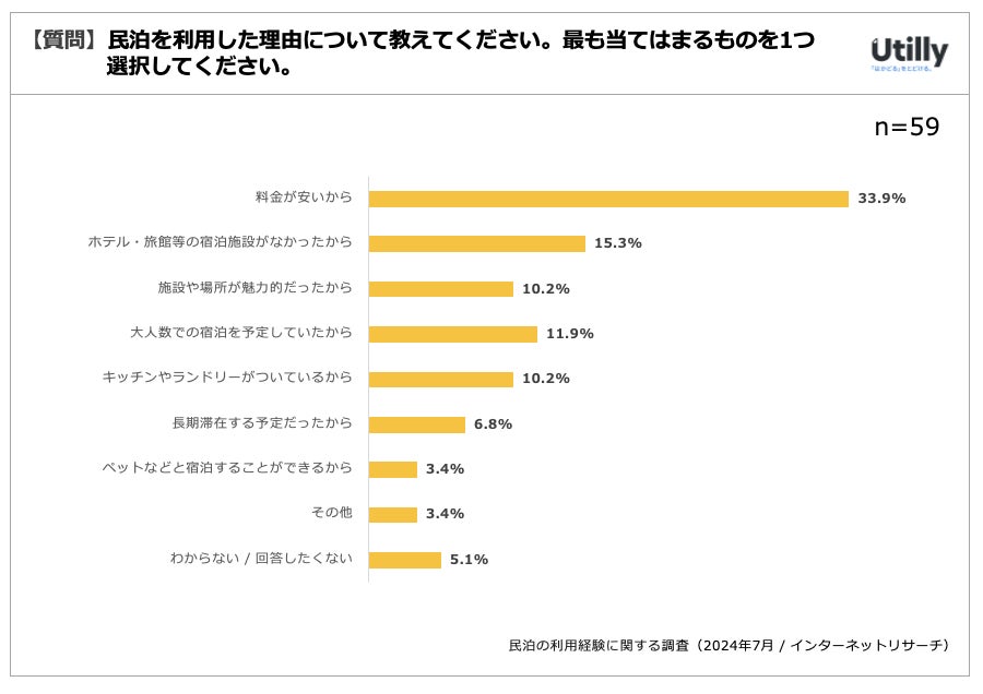 民泊を利用した理由として最も多かったのは『料金が安いから』であり、民泊利用経験者のうち33.9%を占めた。次いで多かったのは、『ホテル・旅館等の宿泊施設がなかったから』で、15.3%であった。