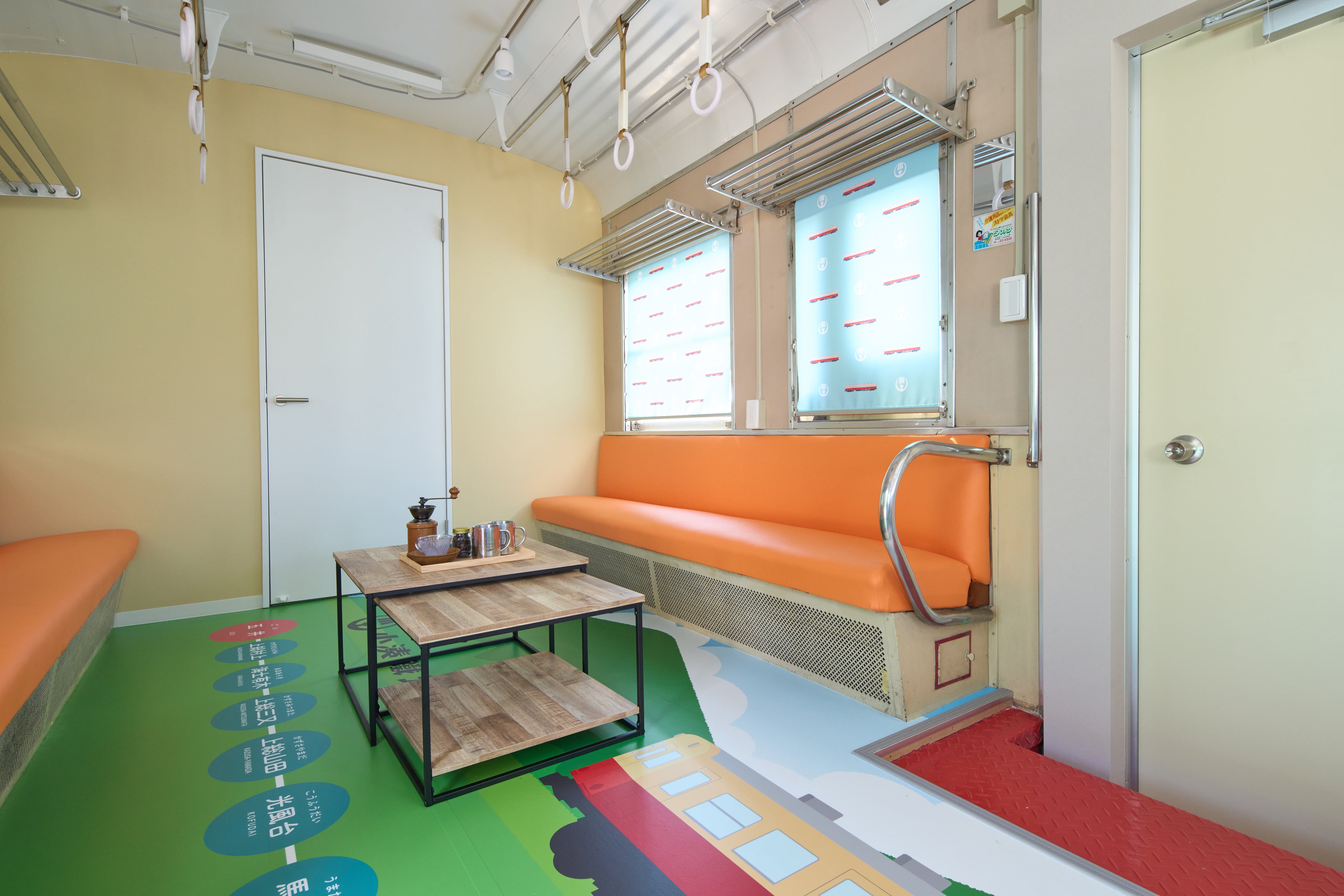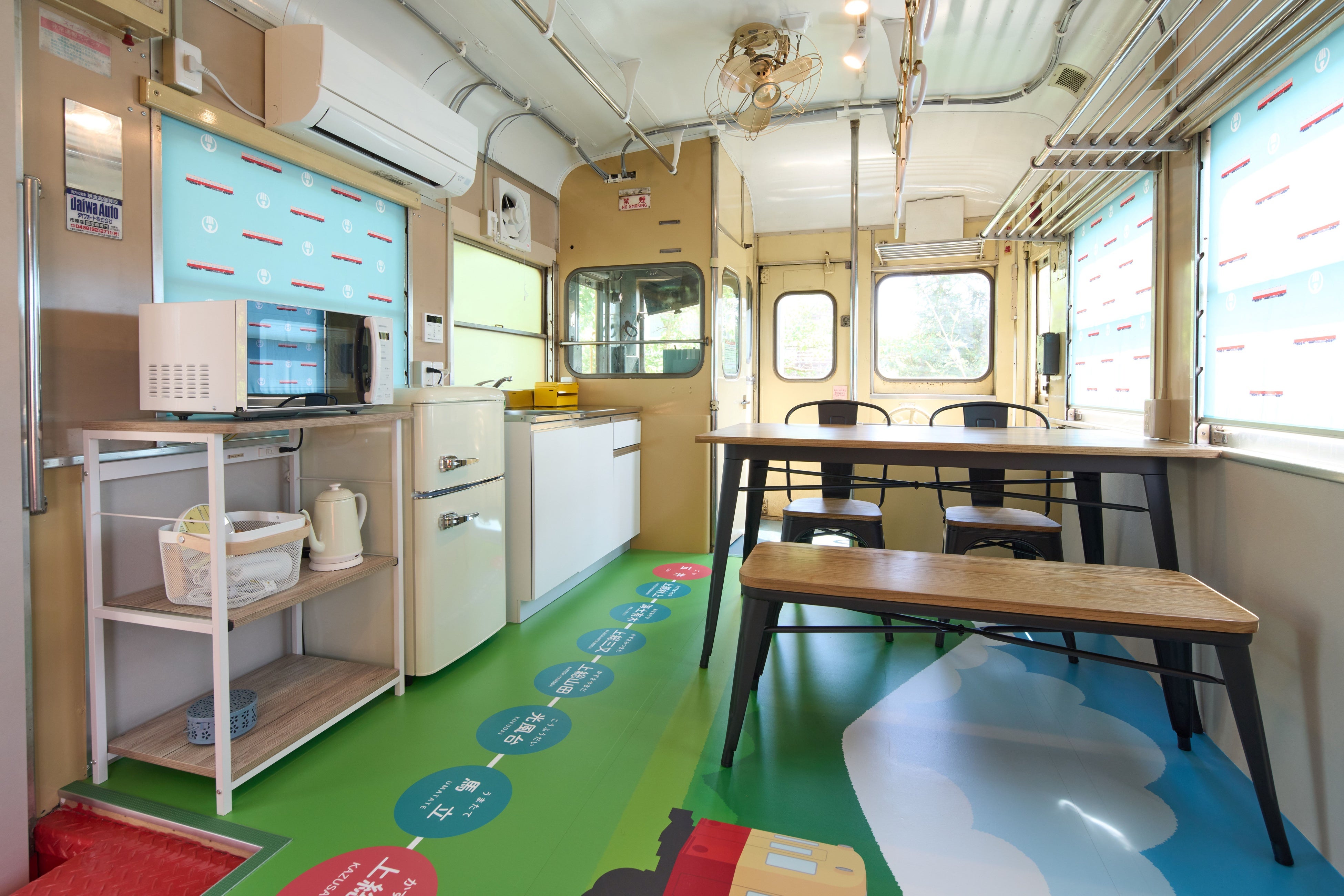 床には路線図が描かれ、車内の細部までキハ203の雰囲気を再現。つり革や座席はそのまま残し、ノスタルジックな雰囲気を楽しめます。