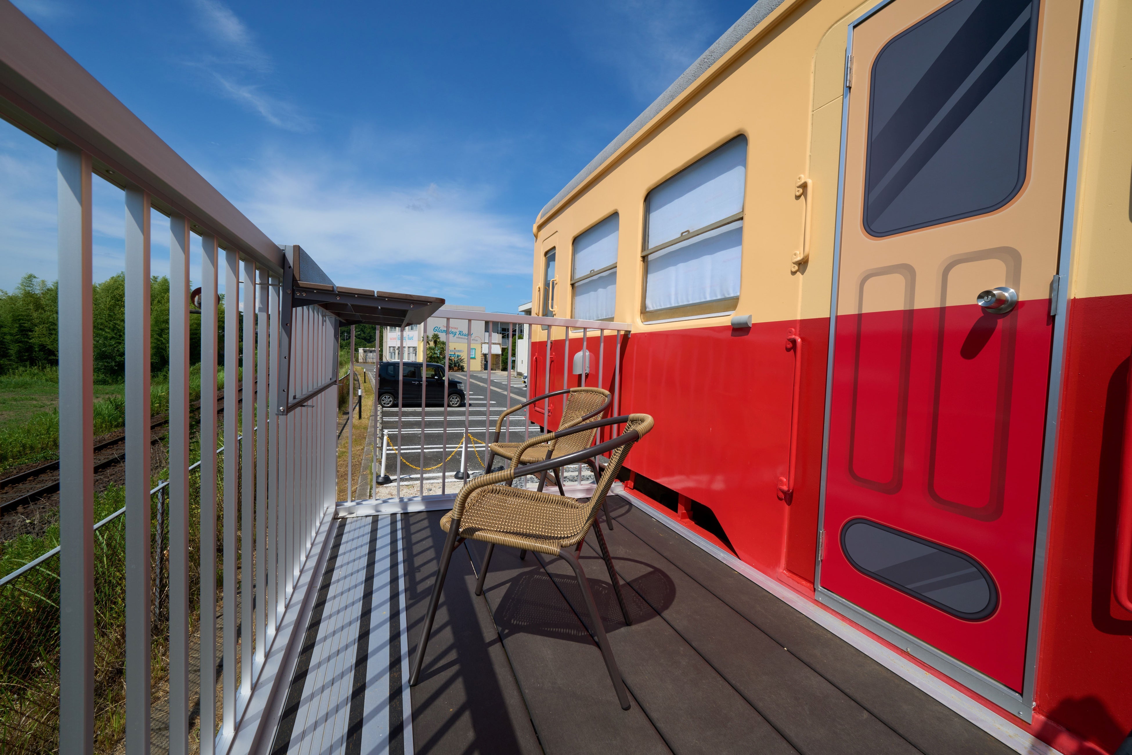 外にはゆったり過ごせるチェアを設置したウッドデッキがあり、目の前の線路を走る小湊鐵道の様子を特等席から眺めることができます。
