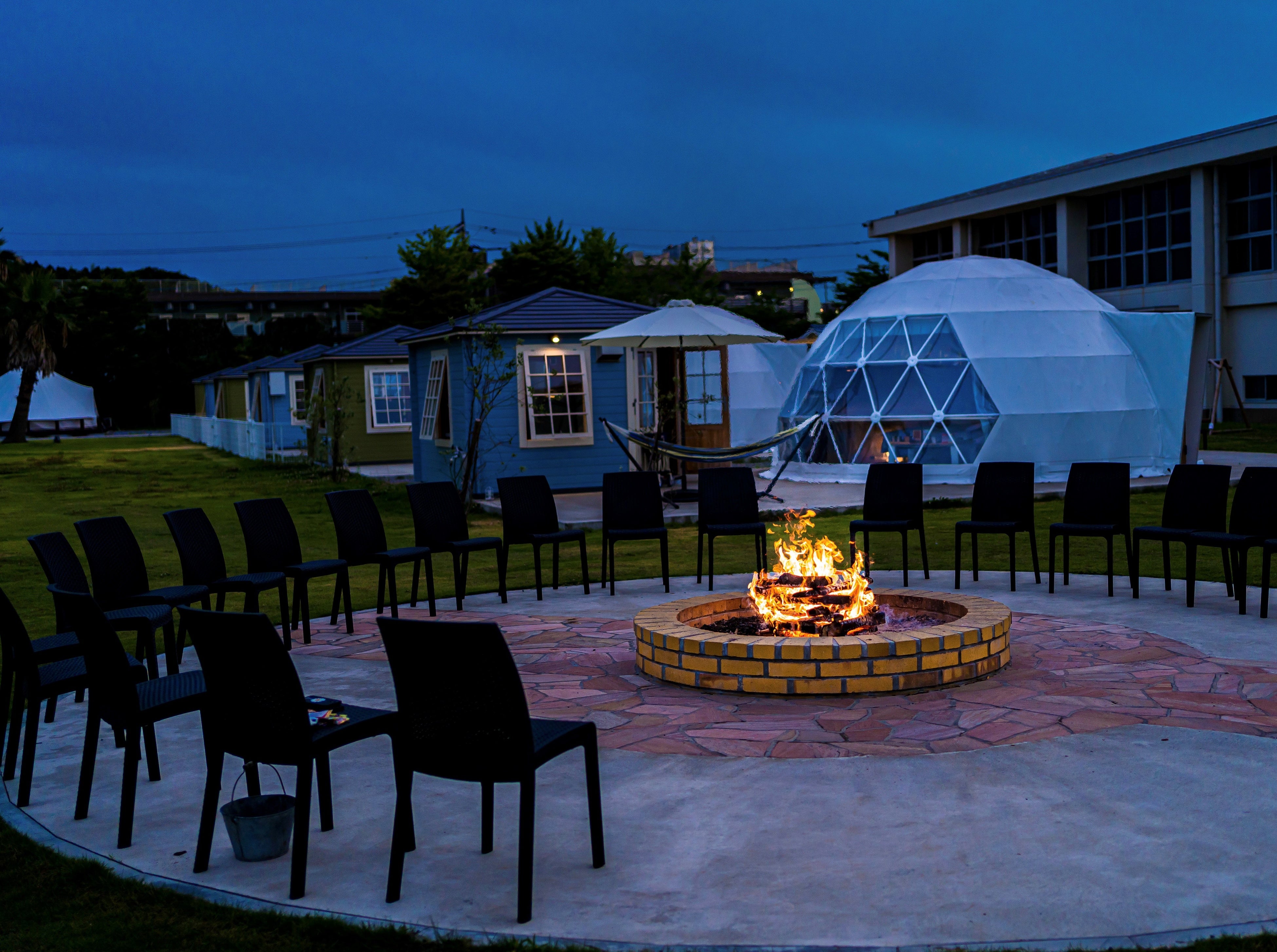 ⾼滝湖グランピングリゾートは廃校となった旧⾼滝⼩学校を千葉県市原市より借り受け、2021年4⽉に開業したリゾート施設です。廃校、グランピング施設ならではの設備やアクティビティが充実しており、キハ203ご宿泊のお客様もご自由にご利用いただけます。