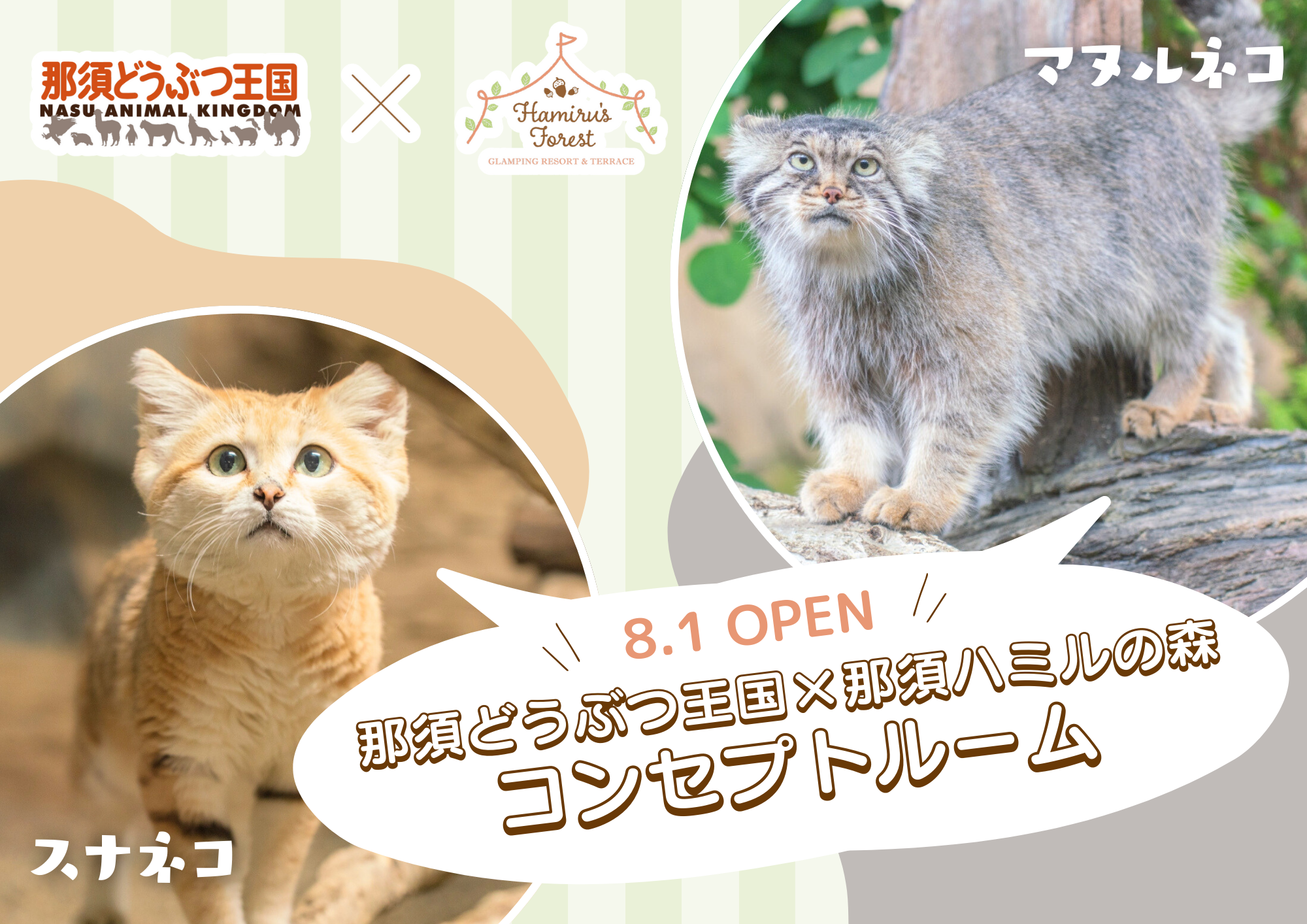 那須どうぶつ王国と那須ハミルの森のコラボレーションによるコンセプトルームの主役は、那須どうぶつ王国の⼈気動物「スナネコ」と「マヌルネコ」です。この2種の動物に焦点を当てた1⽇1組限定の特別なコンセプトルームには下記のような特徴があります。