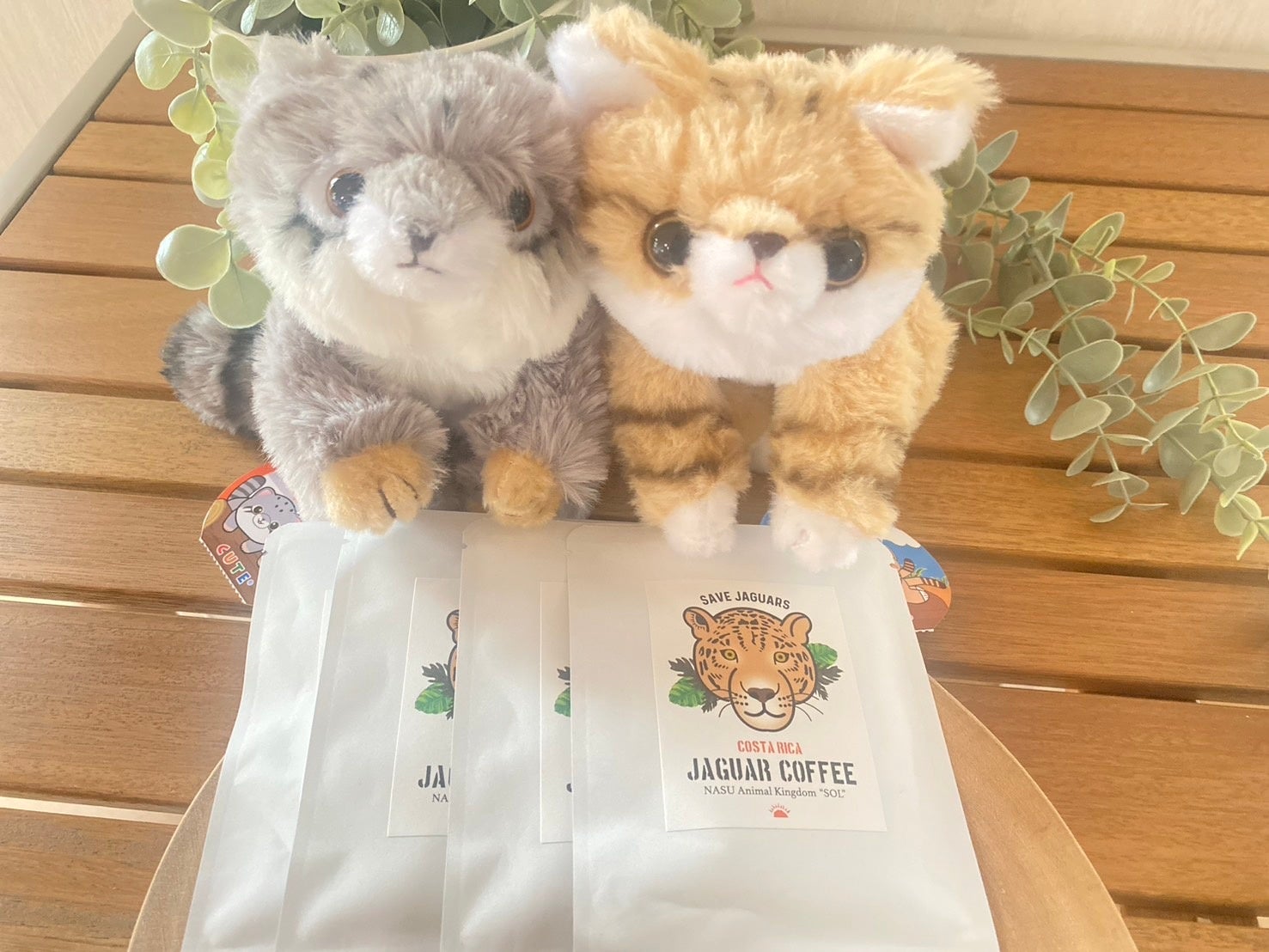 コンセプトルームにご宿泊いただいたお客様には、那須どうぶつ王国公式グッズの「スナネコ」または 「マヌルネコ」のぬいぐるみと、「ジャガーコーヒー」を⼀⼈⼀個プレゼントいたします。「ジャガーコーヒー」はコスタリカに⽣息する絶滅危惧種のジャガーを保護するためのプロジェクトで、このコーヒーを飲むことで私たちもジャガーを守る活動に貢献できます。