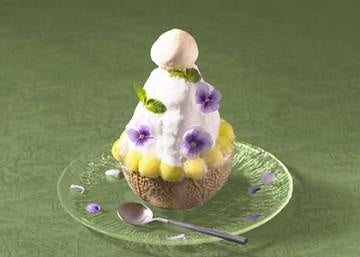 「マスクメロンかき氷」は、半分にカットしたマスク メロンの上に、練乳とメロンシロップを使用したソー スがかかったかき氷を載せた夏らしい一品に仕上がっています。上品な甘みと芳香が魅力の静岡県産のマス クメロンと、クリーミーな味わいのかき氷が絶妙のハーモニーとなっています。