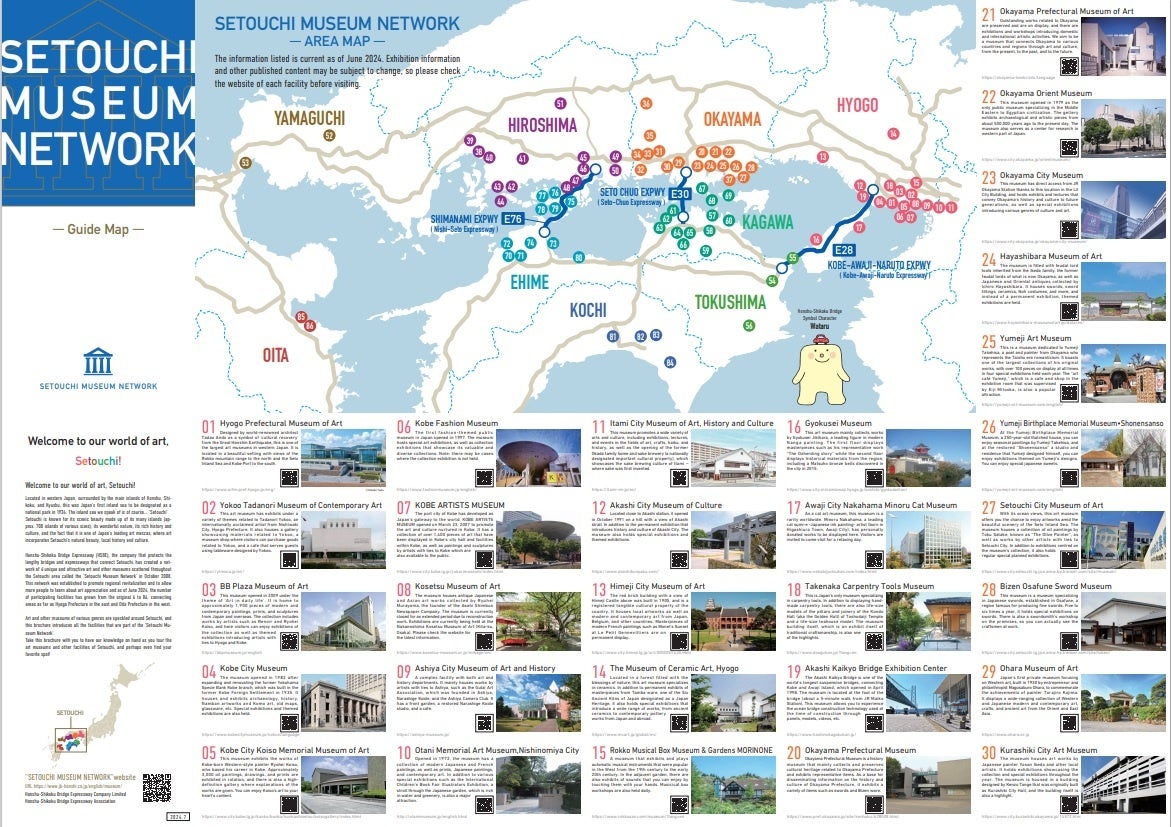 瀬戸内地域に点在する美術館、博物館などの文化芸術施設で構成する「せとうち美術館ネットワーク」(事務局:本州四国連絡高速道路株式会社、一般財団法人本州四国連絡高速道路協会)では、本ネットワークに参加する文化芸術施設(以下、「参加施設」)及び瀬戸内地域全体への訪日外国人(インバウンド)の周遊促進の一助となることを目的に、参加施設を一覧で紹介した英語版マップ『SETOUCHI MUSEUM NETWORK –GuideMap-』(英語版パンフレット)を新たに配布開始します。