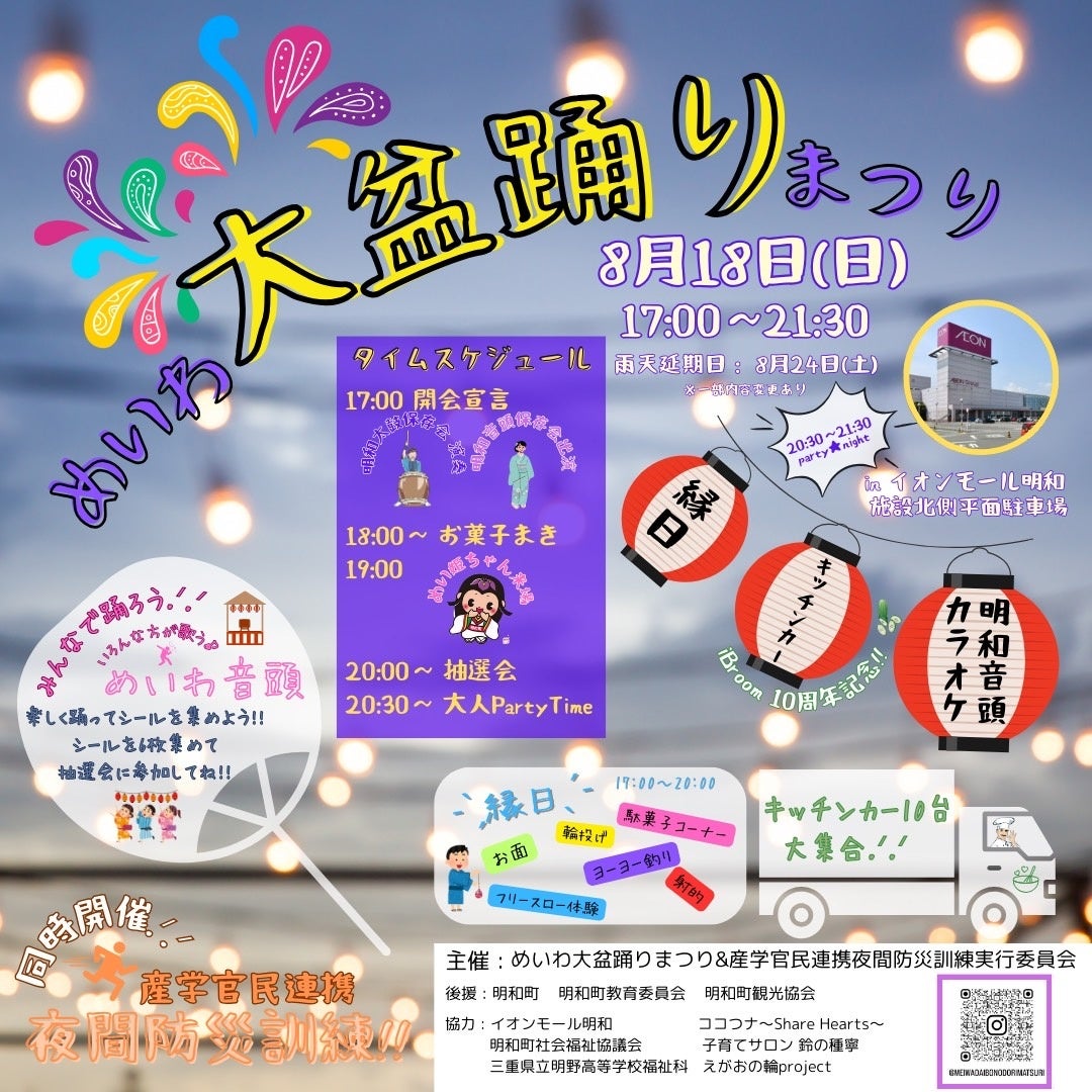 このたび、多様な団体の連携による、「めいわ大盆踊りまつり」(主催:めいわ大盆踊りまつり&産学官民連携夜間防災訓練実行委員会)が、8月18日(日)にイオンモール明和で開催されることとなりました。