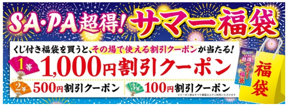 以下期間にて、高速道路のSA・PAで「超得!サマー福袋」を販売いたします。お出かけの際は是非SA・PAにお立ち寄りください。