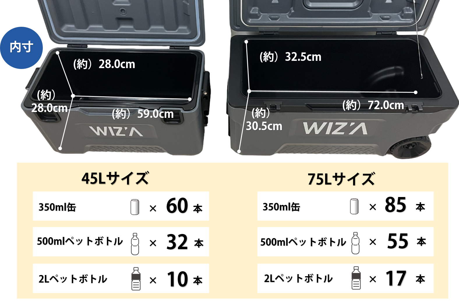 高性能の保冷機能を備えた「5DAYSクーラー」は45Lと75Lの2種類を展開します。それぞれにドリンクホルダーとサイズ計測簡易メジャーが付いています。