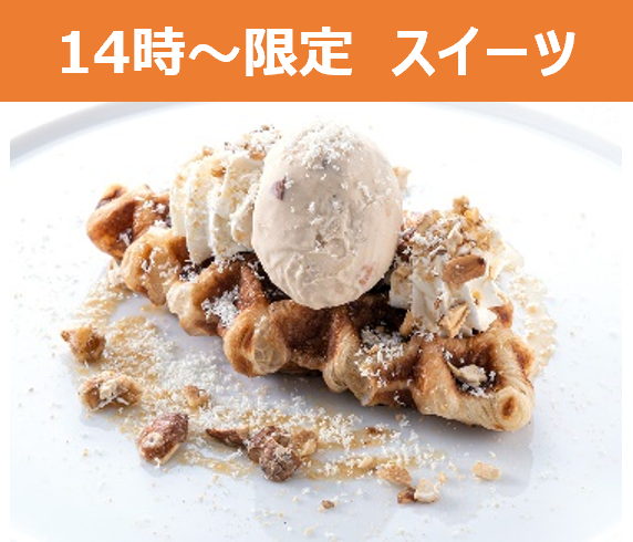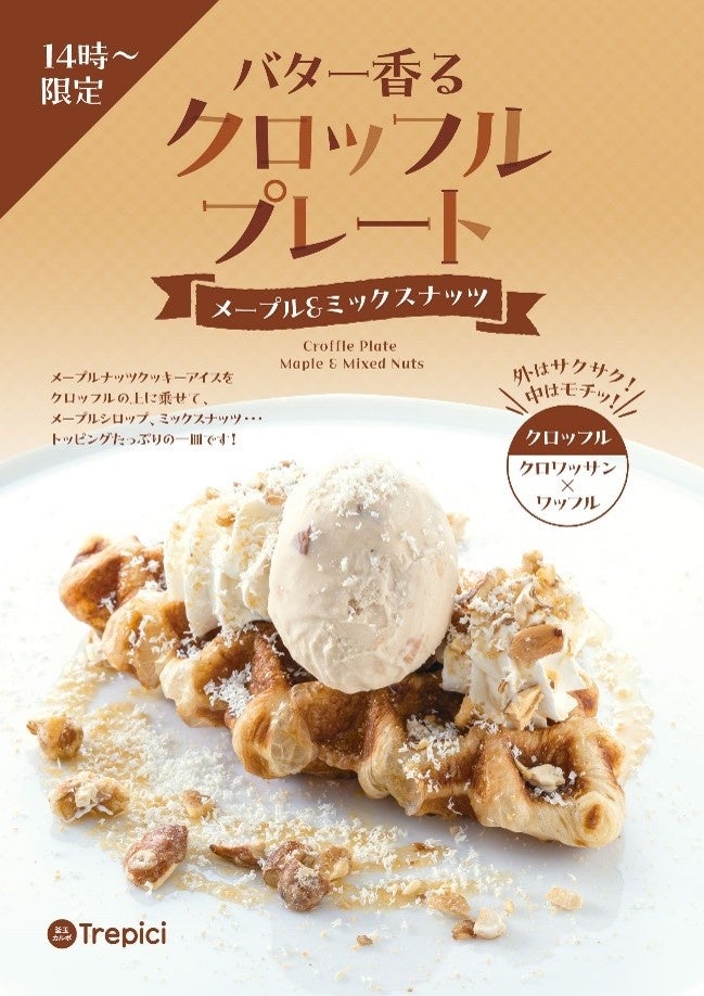 メープルナッツクッキーアイスをクロッフルの上に乗せてメープルシロップ、ミックスナッツなどをトッピングした一皿です。