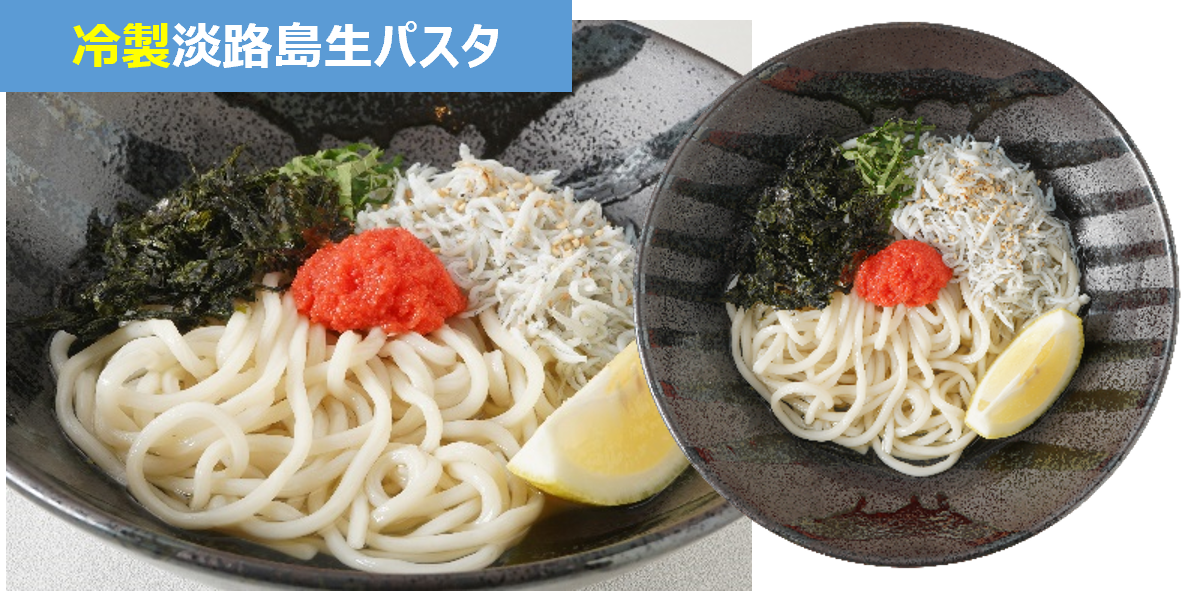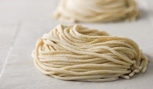 淡路島産デュラム小麦のセモリナ粉と北海道産小麦粉をブ レンド。水だけで打ち上げた生地を丁寧に熟成し、直径3ミリの特注の切り刃でカットした極太麺です。