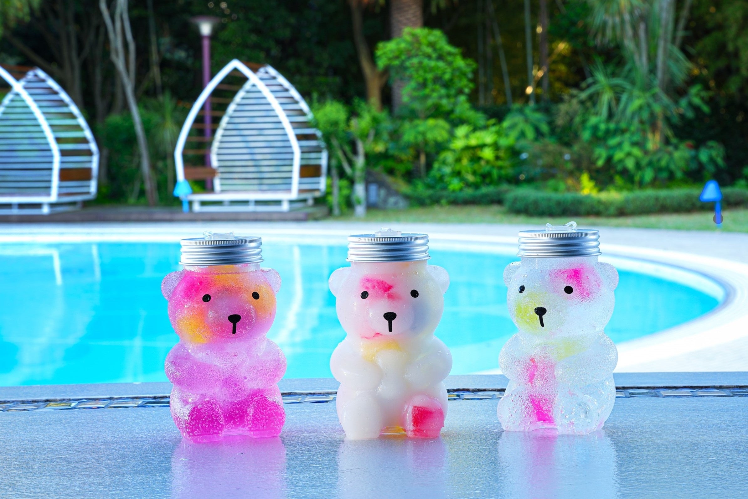 さらに、ホテルオリジナルボトル入り「ピンクフルーツフィズ」や、くまボトルに入ったゼリー入りオリジナルドリンク「ももくま」「白くま」「クリスタルくま」が新登場!デイプールとのコントラストも美しいメニューの数々が、滞在の思い出に華を添えます。