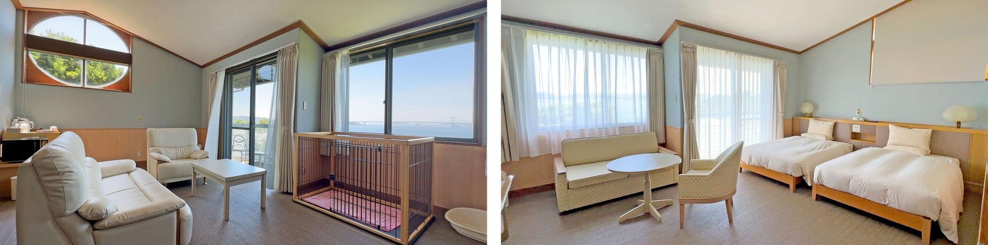 本館から少し高台に位置するドギ-・ヴィラならではの瀬戸内海の絶景を眺める静かな客室は、南西向きの2つのバルコニーで、ゆったり自然の中でワンちゃんとリラックスできる時間が過ごせます。
