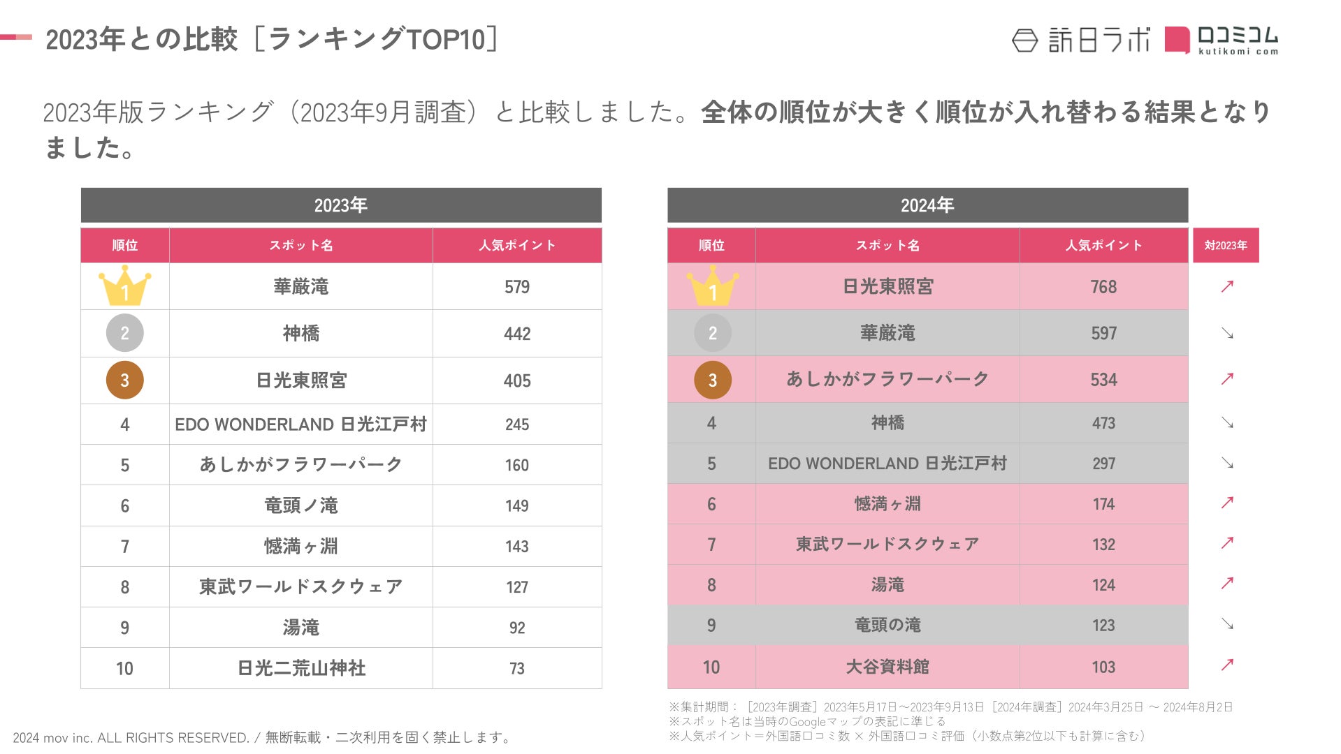 また、2023年版ランキングでは日光東照宮は3位だったものの、2024年版では1位を獲得し、順位が大きく変動しました。