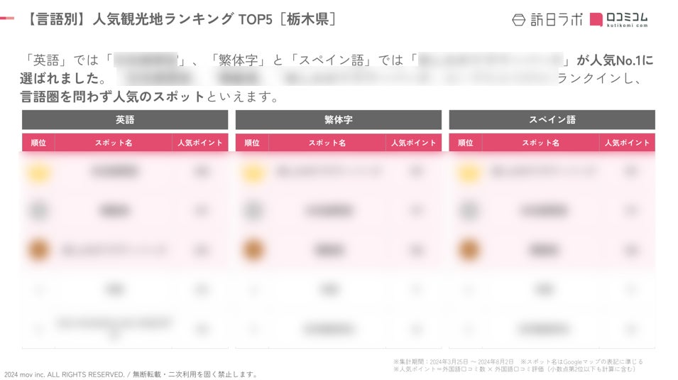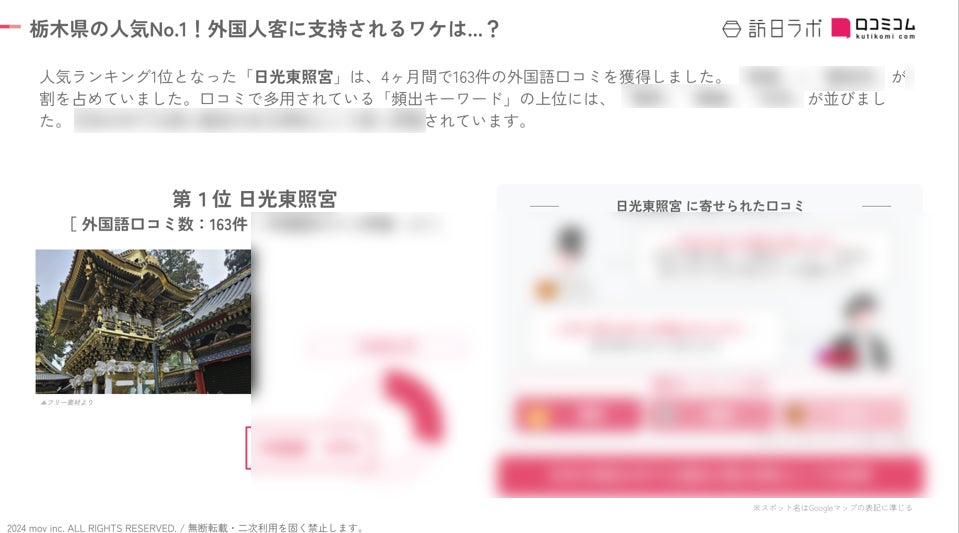 業界最大級のインバウンドビジネスメディア「訪日ラボ」及び AI店舗支援SaaS「口コミコム」を運営する株式会社mov(代表取締役:渡邊 誠、本社:東京都渋谷区、以下mov)は、各都道府県の観光スポットに寄せられた最新の口コミデータから、独自の『インバウンド人気観光地ランキング』を発表しました。