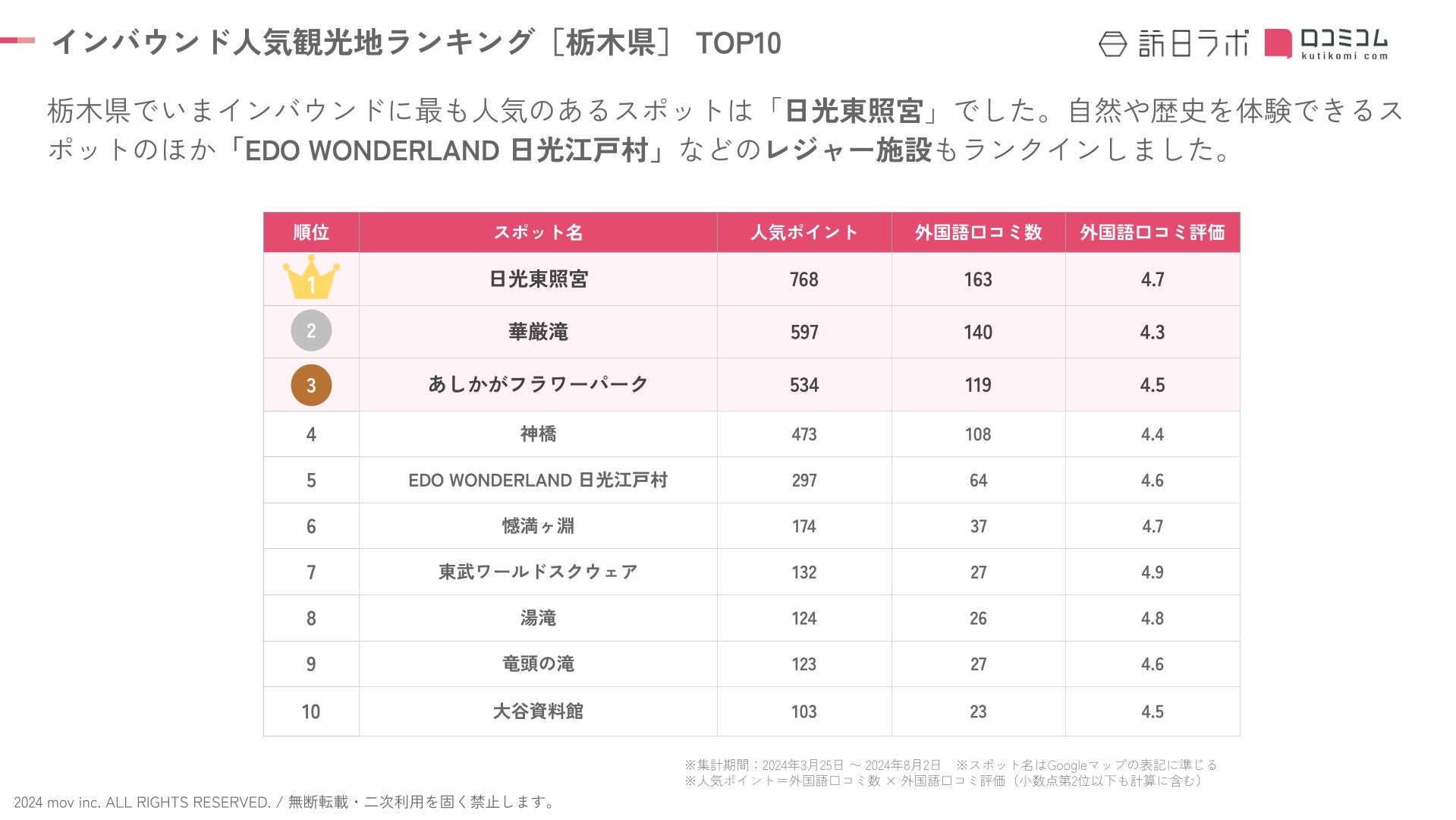 <インバウンド人気観光スポットランキング[栃木県編] TOP10>