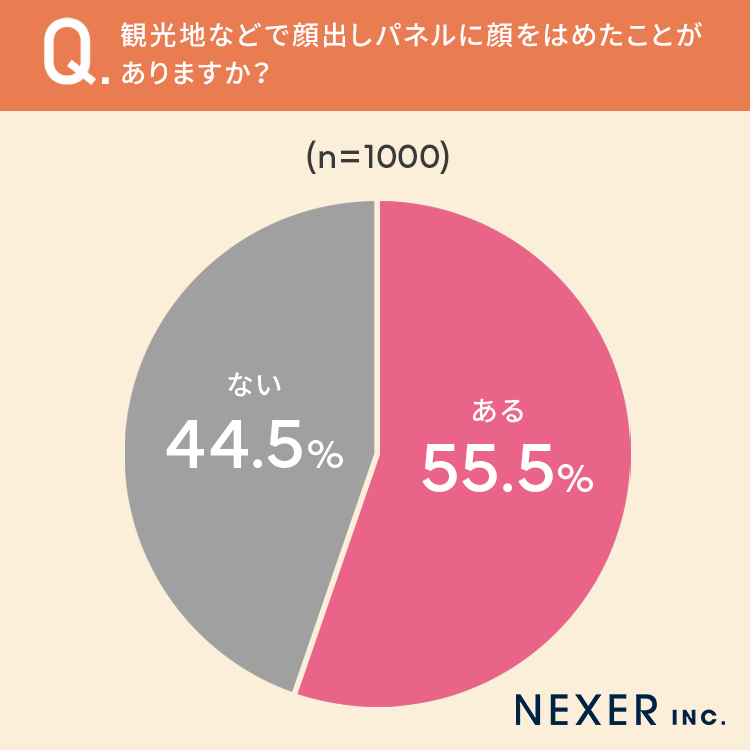 ■55.5%が、観光地などで顔出しパネルに顔をはめたことが「ある」