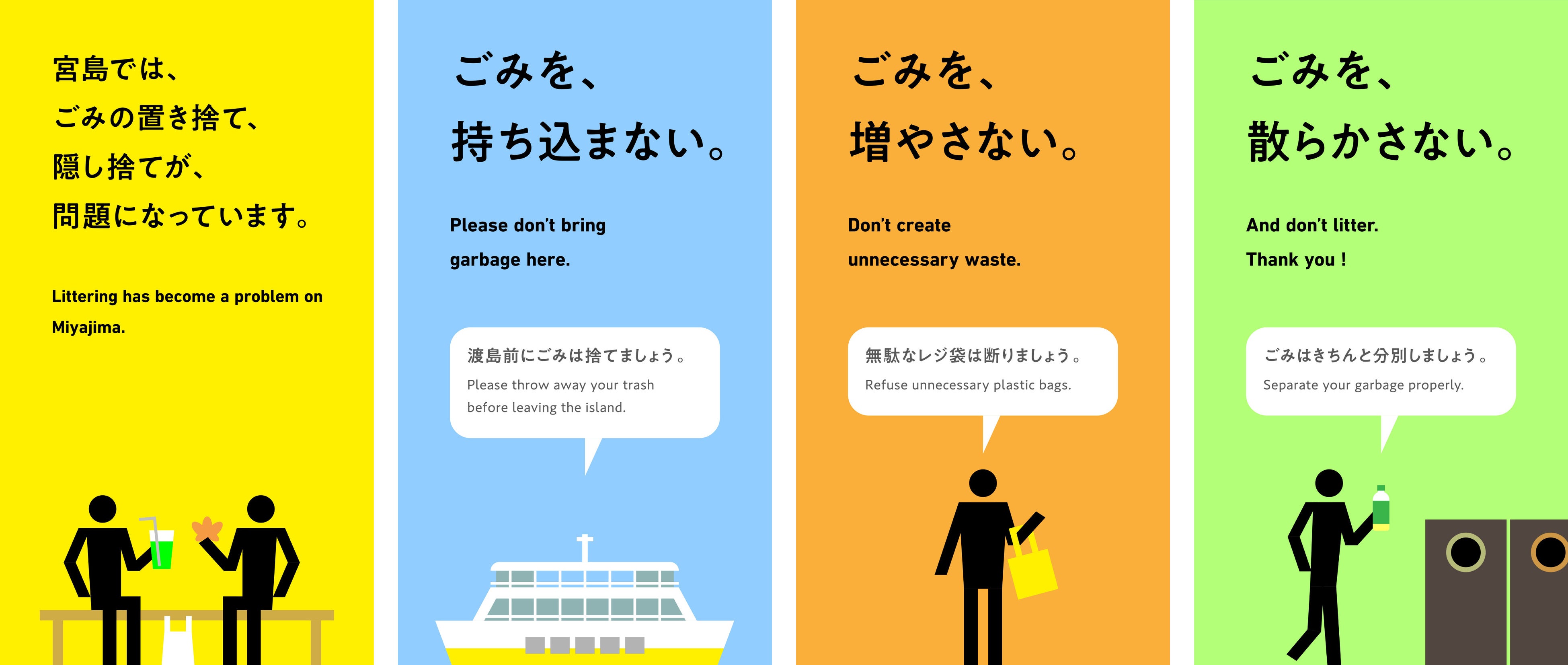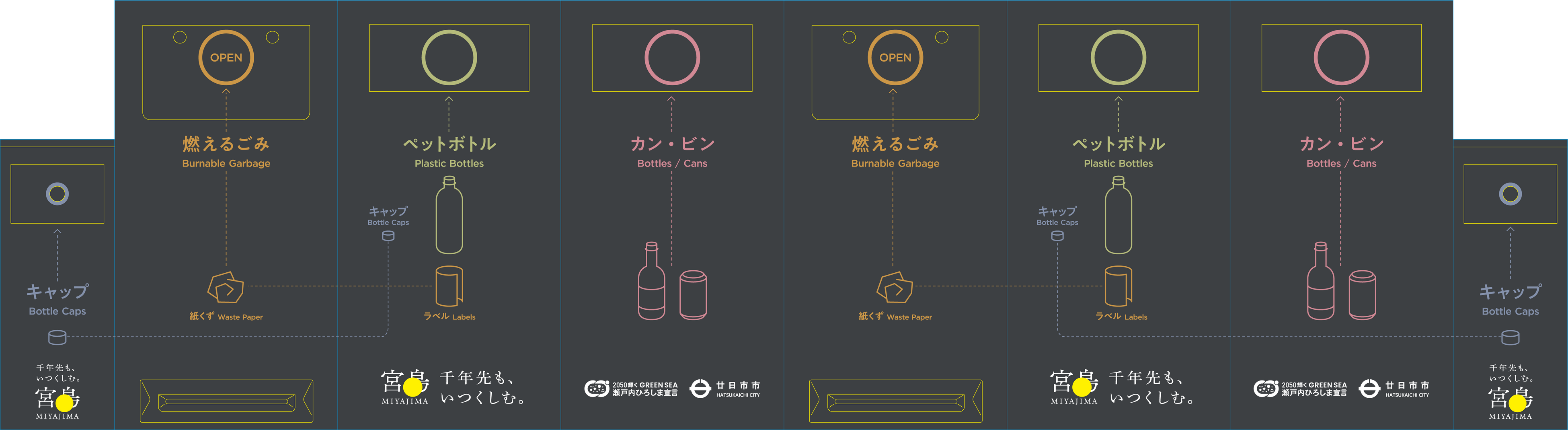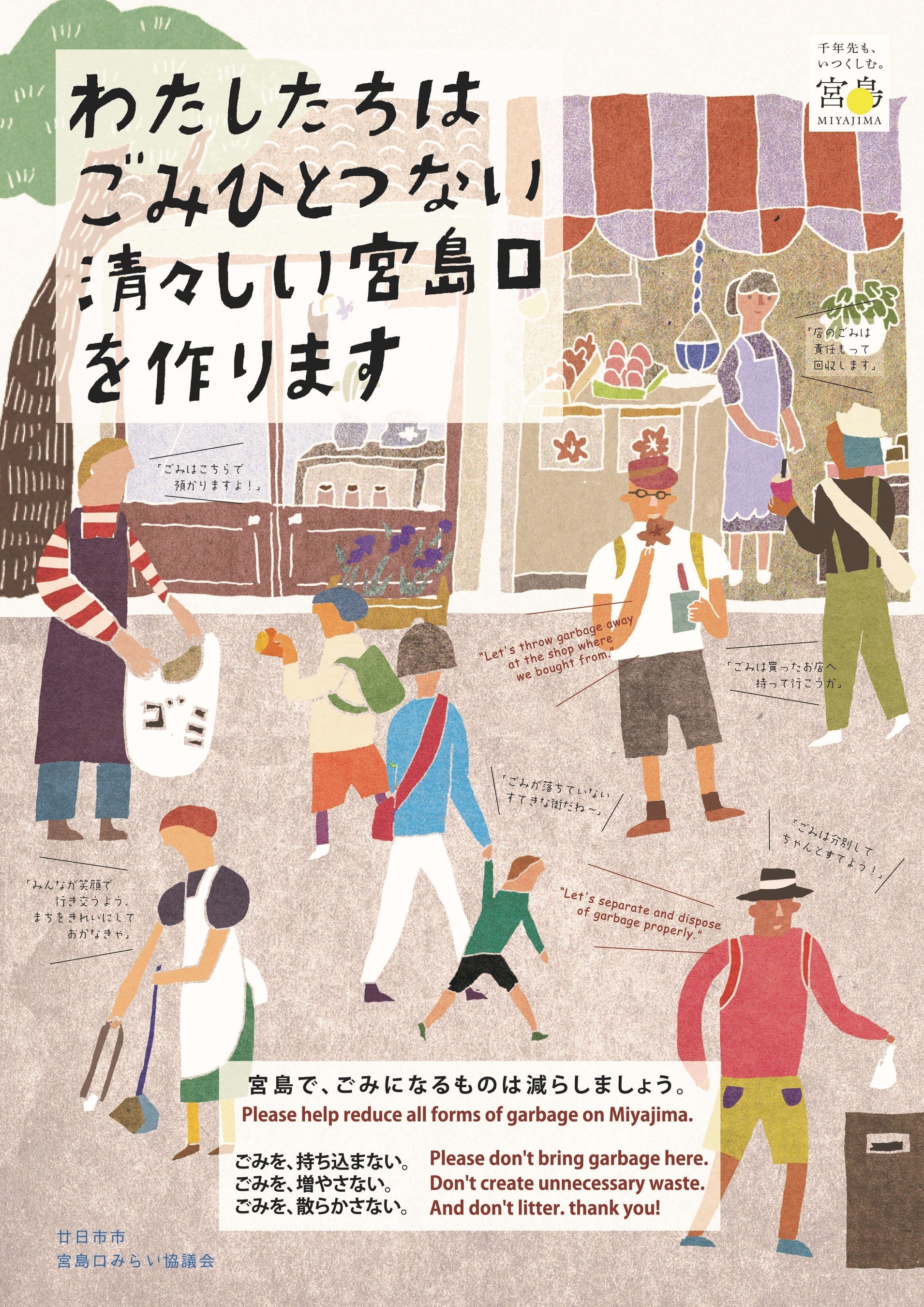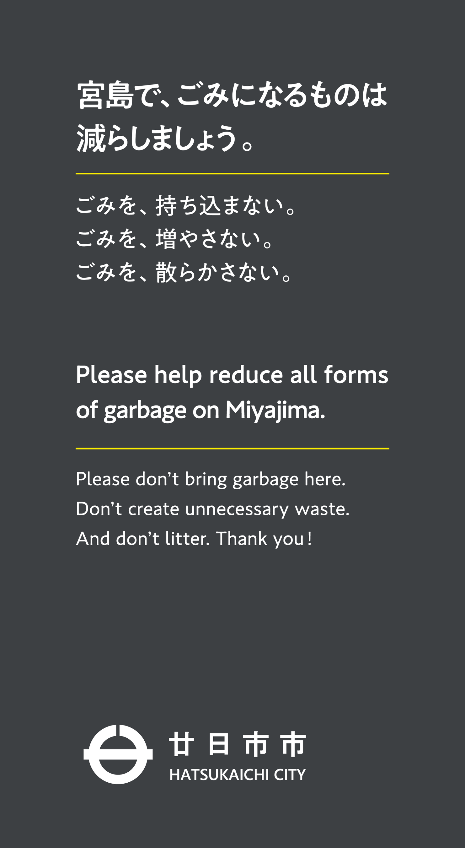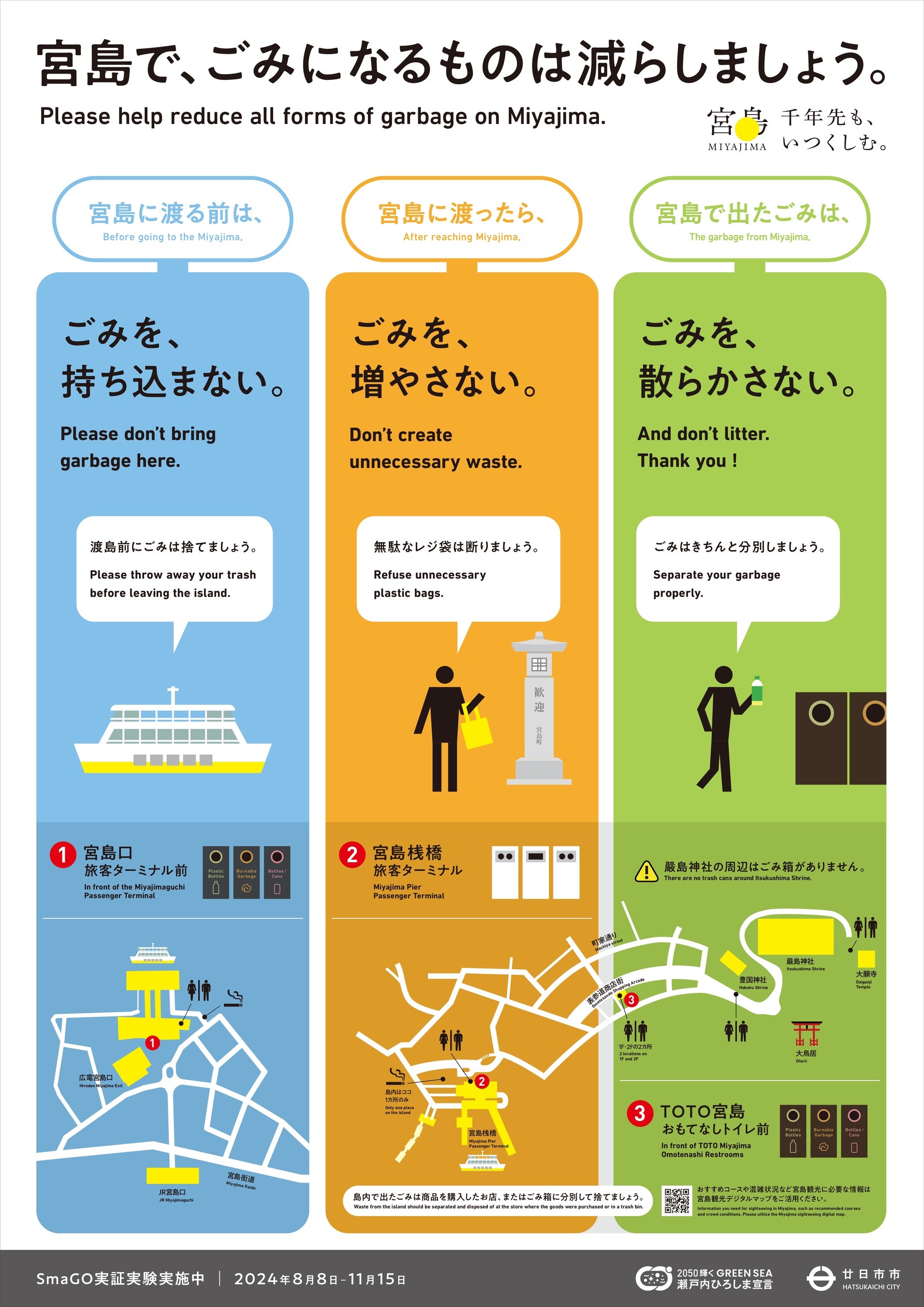 宮島の持続可能な観光地域づくりを目指し、宮島のすべてを未来につなぐため、今を生きる私たちにできることは何か、その思いから宮島に関わるすべての人に心がけてほしいことをスローガンにしました。「SmaGO」本体やポスターを活用し、ごみの減量やごみ箱の位置、マナー啓発、分別啓発の情報発信をしています。
