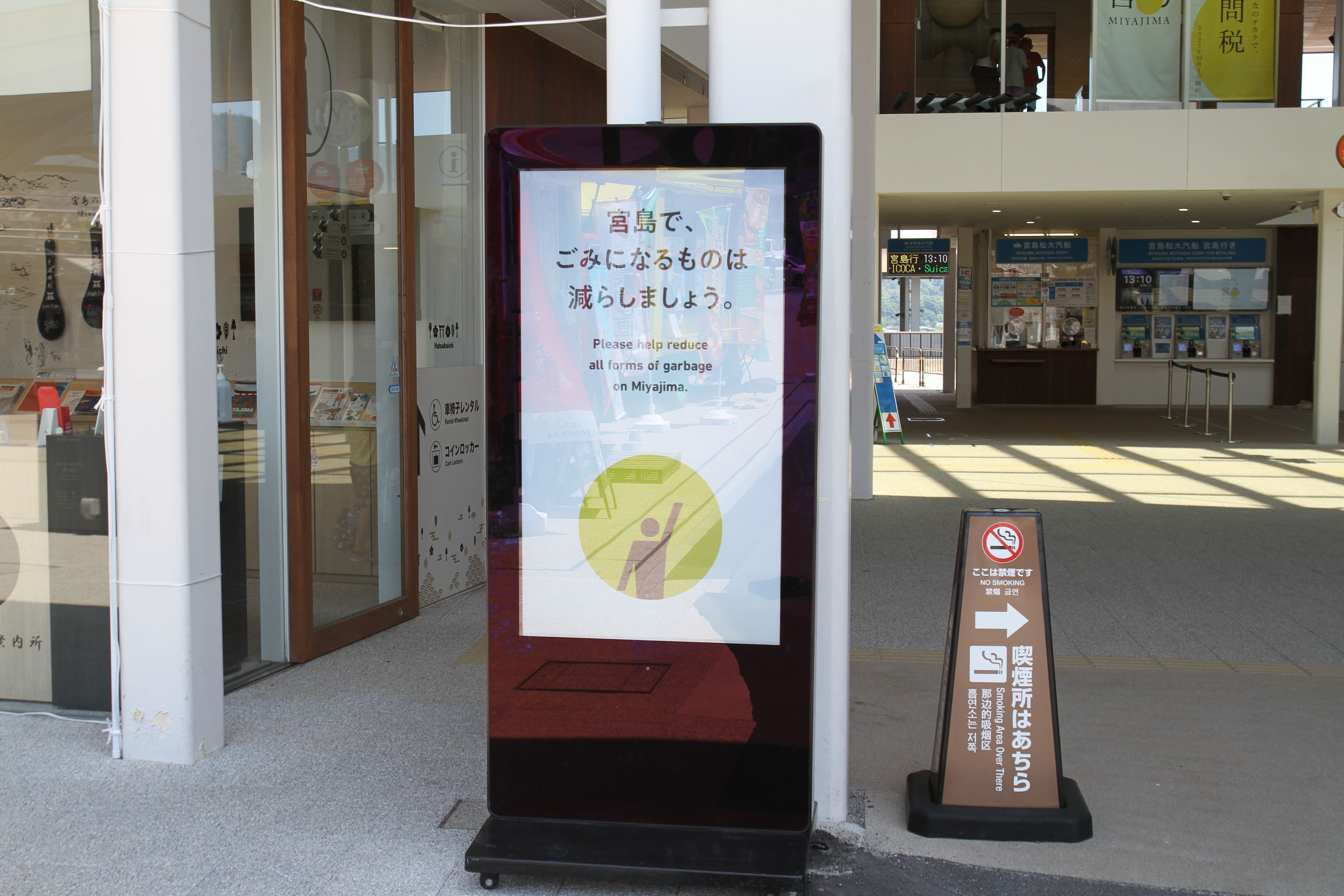 宮島口旅客ターミナル施設に設置されたデジタルサイネージや観光客のスマートフォンから見ることができる観光マップ(デジタル周遊マップ)で「SmaGO」の設置場所の表示を予定しています。また、ペットボトルの3分別(ボトル、キャップ、ラベルの分別)をはじめとして、ごみの分別やリサイクルに関する情報をデジタルサイネージで発信することで、マナーの啓発活動に取り組みます。