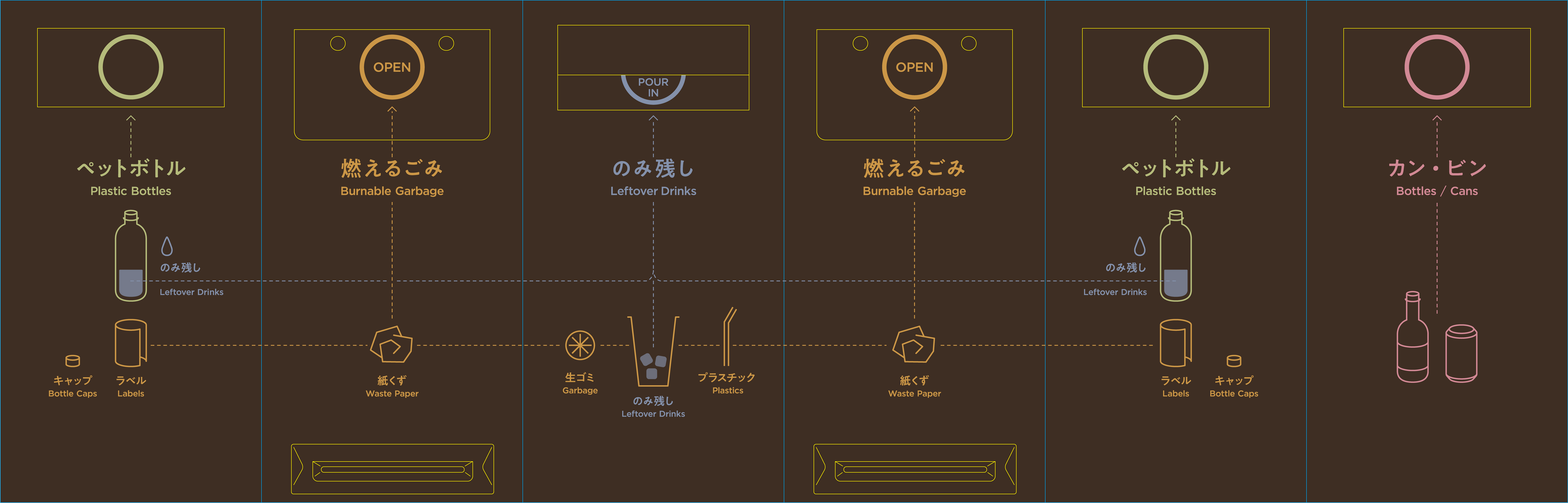 全国清涼飲料連合会と連携し、BIPROGYが研究を進めているナッジ(注1)や仕掛学(注2)、インフォグラフィックス(注3)を活用したデザインで、「SmaGO」をラッピングしています。カテゴリーごとの色分けや、矢印を辿るゲーム性、注目を集めやすい丸い形状などで、ついごみや飲料容器を分別したくなるよう行動変容を促し、ごみの分別や飲料容器のリサイクルを促進します。ペットボトルについては、3分別や飲み残しの適切な処理を促すデザインを追記することで、リサイクルの取組を促進します。また、景観と調和したシンプルでスマートなデザインを採用しています。