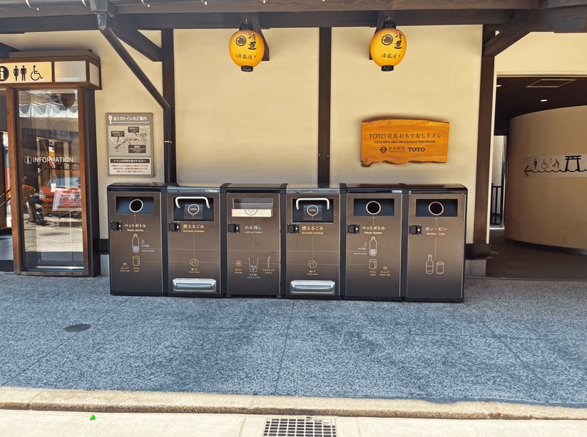本モデル事業では、多くの観光客が往来する宮島口旅客ターミナル施設と、島内の表参道商店街(TOTO宮島おもてなしトイレ)にIoTスマートごみ箱「SmaGO」を設置します。TOTO宮島おもてなしトイレには、国内では初めての設置となる「SmaGO飲み残し専用BOX」が設置されます。