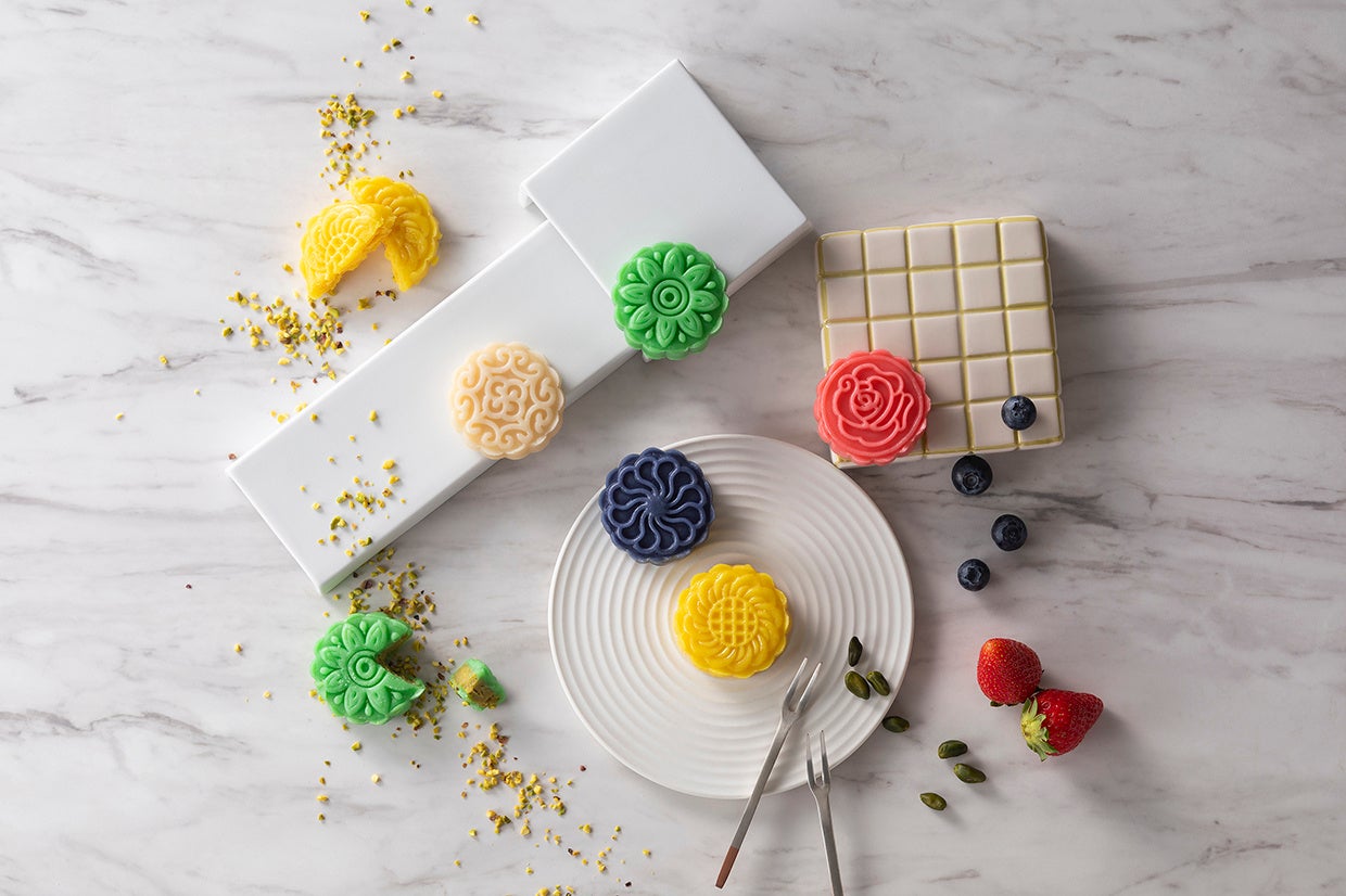 プレーン、ストロベリー、ブルーベリー、パッションフルーツ、ピスタチオ、それぞれのフレーバーで楽しむ濃厚なチーズケーキを、上品な甘さの白餡をベースにした生地で包み込んだ月餅は新感覚の味わい。見た目も可愛らしく贈り物にもおすすめです。