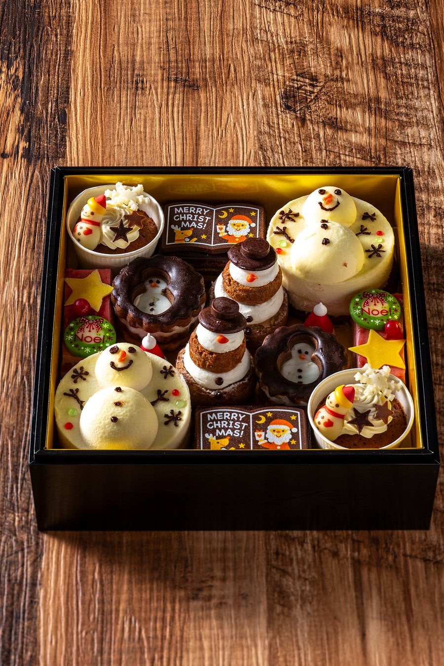 例年人気の「おもたせクリスマス」は、「さんた」、「となかい」、「すの~すた~」の3種類の中から7パターンの重箱の組み合わせが選べます。「さんた」は、重箱に苺のデコレーションケーキとミニケーキアソートを、「となかい」と「すの~すた~」はクリスマスを象徴するトナカイや雪だるまなどをイメージした可愛らしいミニアソートを詰め込みました。一段重から三段重までを組み合わせ自由に選べるので、家族の団らんや友人とのパーティなど、それぞれのシチュエーションに合わせた愉しみ方ができます。風呂敷でお重箱を包んだ、京都らしくおもたせにもぴったりなクリスマスケーキです。