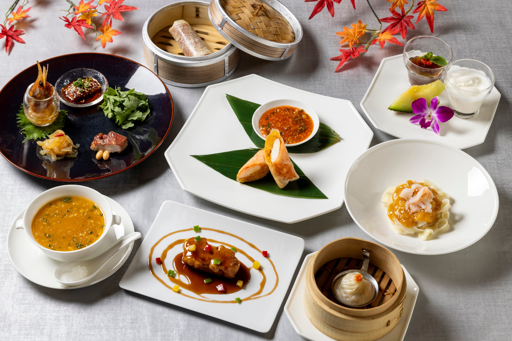 中国で秋の味覚の代表格として名高い上海蟹を、贅沢に前菜や点心、締めのお料理までふんだんにつかったディナーコースが登場いたします。ひと口でその旨味が口いっぱいに広がる上海蟹をたっぷり包んだ小籠包や美容効果も期待できる高級食材であるツバメの巣を乗せた上海蟹のコラーゲンスープ、タラバ蟹と上海蟹を贅沢につかった春巻きなど、風味豊かなお料理の数々がそろいます。春巻きは、まずは何も付けずに蟹本来の味をお楽しみいただいたあと、チリソースをつけてお召し上がりいただくのがおすすめです。メインの肉料理は、チャイナルームでご好評の3品からお好みに合わせてお選びいただけます。お食事の最後には、上海蟹のあんかけを絡めてお楽しみいただける刀削麺もご用意いたしますので、上海蟹の身と濃厚な蟹みその両方を心ゆくまでご堪能いただけます。