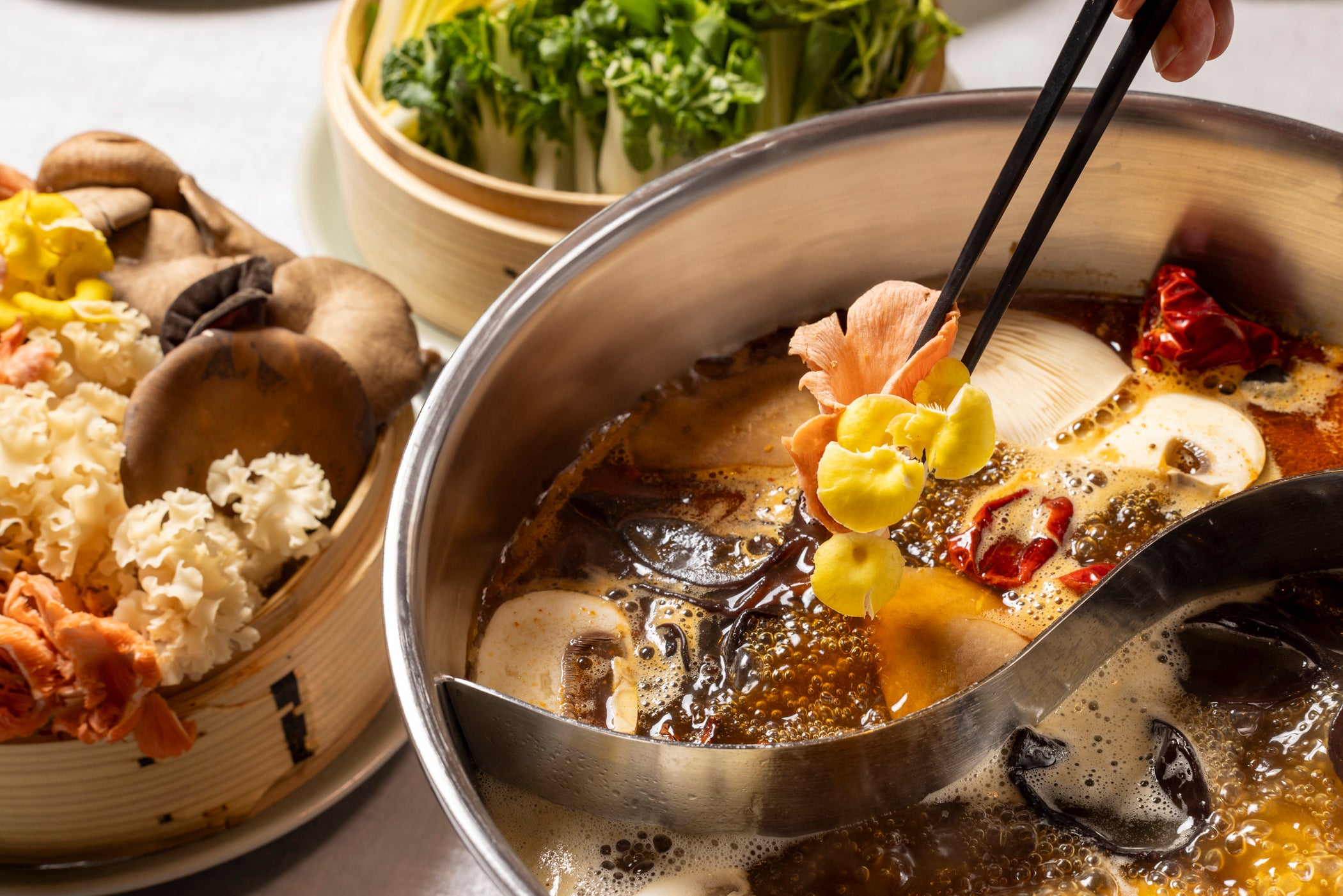 ◆コラーゲンたっぷりの自家製スープに10種類のキノコを絡めて食べる火鍋が登場