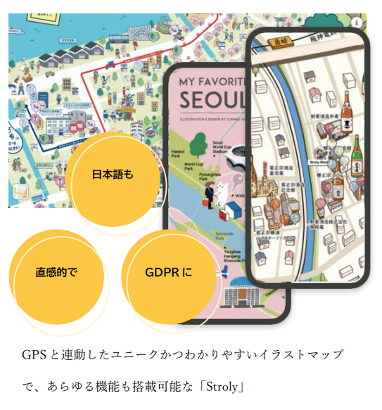イラストデジタルマップ「Stroly」は、世界観を感じられるわかりやすいイラストを通じて、そのエリアのワクワクする情報に「出会って・知って・体験する」までを徹底的にガイドする世界で唯一のイラストマップとロケーション技術を組み合わせたWEB型のマッププラットフォームです。アプリのダウンロードは不要。イラストや手描き、どんなデザインのオリジナルマップでも縮尺はそのままにGPSと連動でき、今どこに自分がいて、近くにどんなおすすめ情報があるのかが一目で確認ができます。課題や目的に応じて最適化されるため、利用者の「次」の行動を促すことができます。