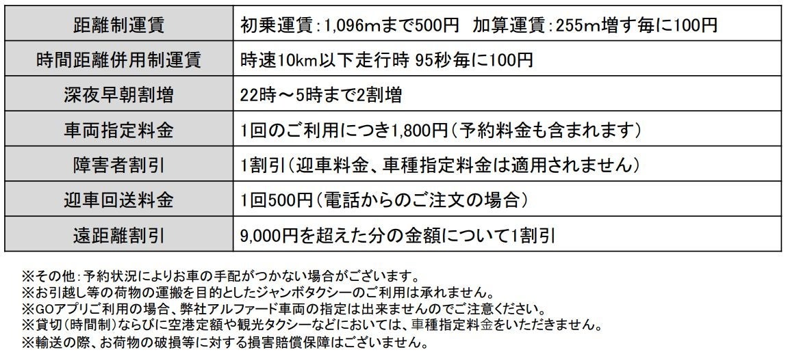 利用運賃はセダン型のタクシーと変わりません(車両指定料金1回1,800円別途)ので非常にお得です。⼤勢でご乗⾞される際や、⼿荷物の多い時は便利でお得な「新型アルファードタクシー」をお試しください。