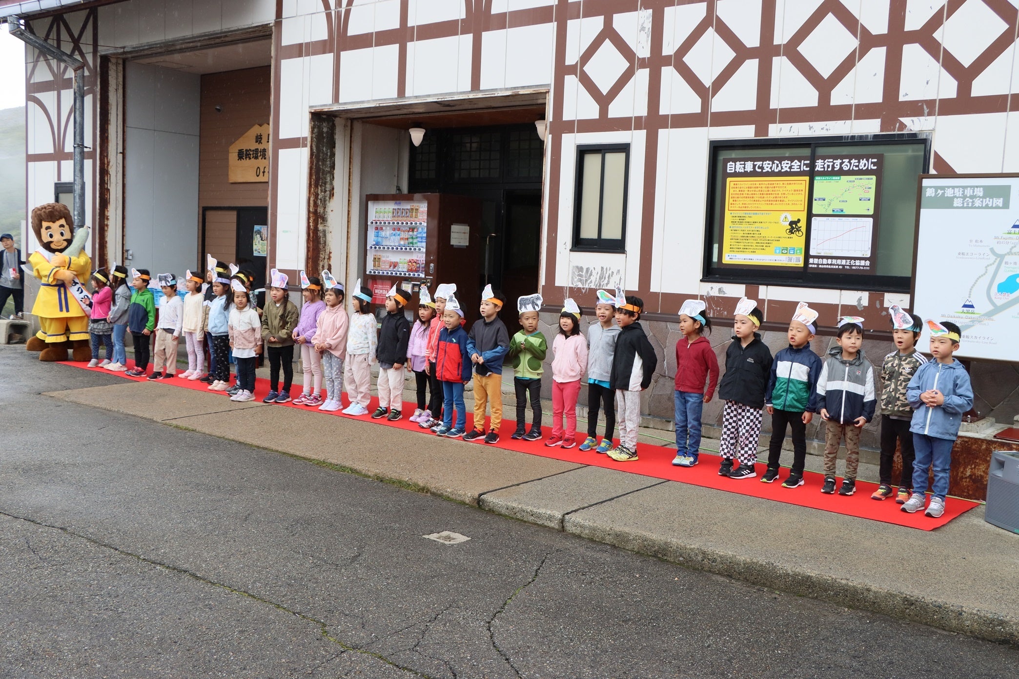 乗鞍バスターミナルの前では、丹生川町のこま草保育園の園児による元気一杯な合唱披露が行われ、集まった観光客や関係者を楽しませてくれました。また、来訪の皆さんへ地元の特産品であるトマトが配布され、乗鞍スカイライン開通の喜びを共に分かち合いました。