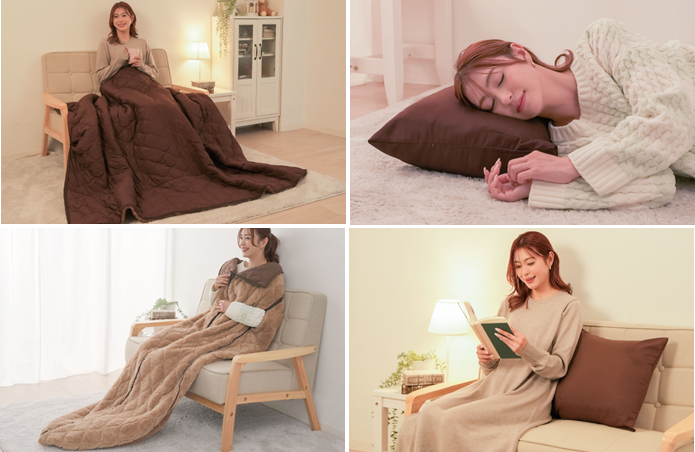 ②リラックスタイム:リビングのひざ掛けとして使ったりと、寒い季節に大活躍です!使用しない時はクッションにして置いておけば、リビングに溶け込んで違和感なくお使い頂けます!