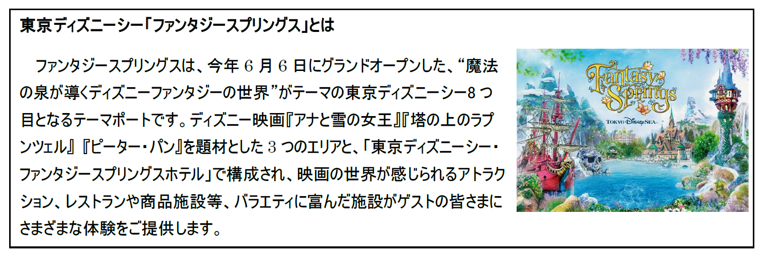 「ファンタジースプリングス」は、ディズニー映画『アナと雪の女王』『塔の上のラプンツェル』『ピーター・パン』を題材とした3つのエリアと、「東京ディズニーシー・ファンタジースプリングスホテル」からなる、世界で唯一のテーマポートです。
