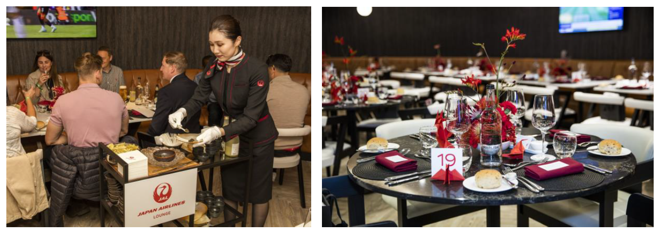 「JAPAN AIRLINES LOUNGE」は、前身の「1892 Club」というラウンジを新たに改装したもので、これまでのリバプールFCファンの方にも愛されていた当ラウンジのエッセンスを残しながら、ご利用いただくすべての方にJALのホスピタリティと、リバプールFCのサッカー観戦の興奮を同時に味わっていただけるようなデザイン・サービスコンセプトで設計されています。木材の温もり、柔らかな照明、そしてモダンで洗礼された家具によって織りなされるデザインが特徴です。また、試合開始までレストランスタイルでコース料理を楽しみながら優雅にお待ちいただくことができるほか、ご利用される方には限定のリバプールFCオリジナルギフトをご用意しております。