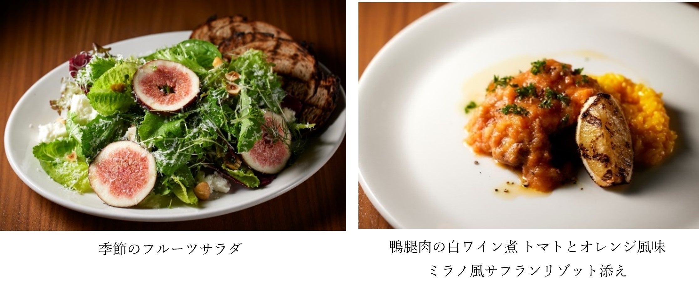 メインディッシュの一押しは、ミラノを代表する伝統料理「オーソブッコ」を秋の風情に合わせ、鴨腿肉を使用してアレンジした白ワイン煮込みです。トマトとオレンジの爽やかな風味で仕上げられ、ほろほろとほぐれる柔らかさが魅力です。黄金色に輝くサフラン風味のリゾットを添え、本格的なイタリアンの味わいを存分にお楽しみいただけます。秋のまだ残暑が残る日でも、爽やかに味わっていただける一品です。
