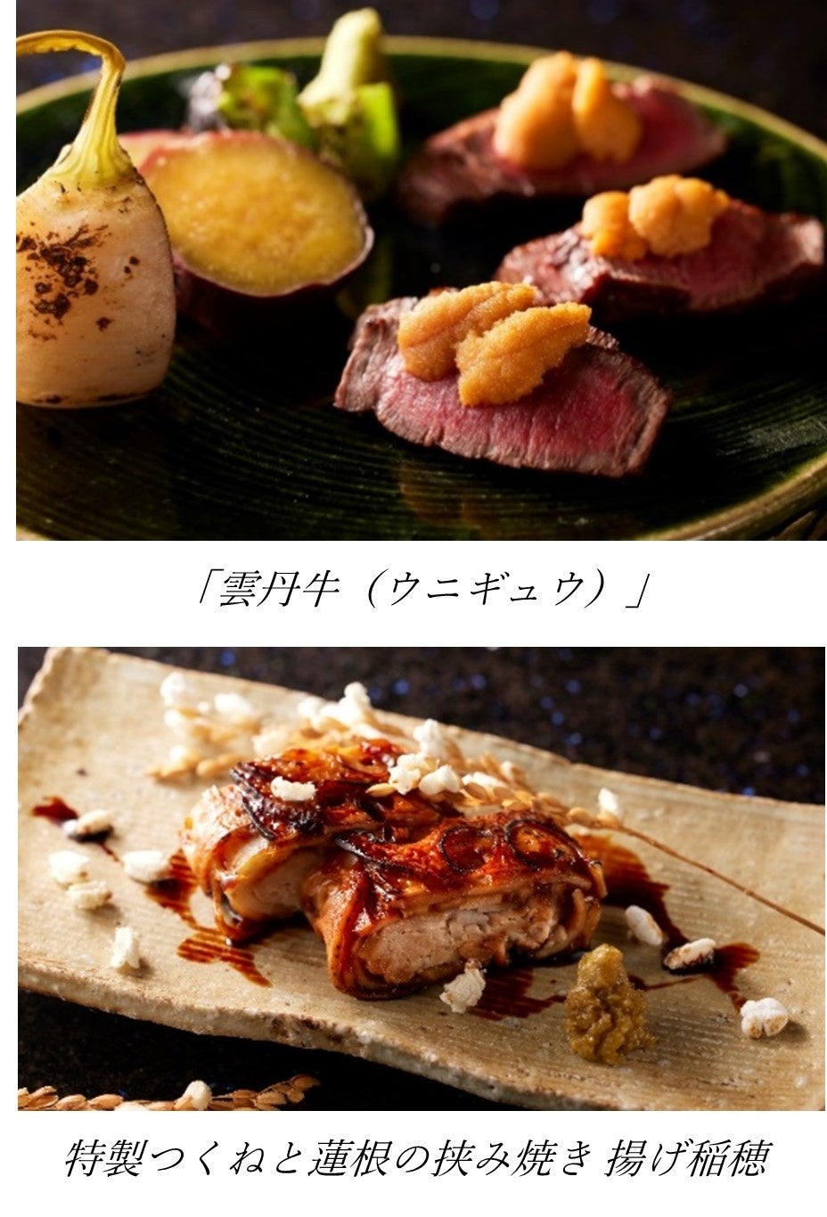OMIKAコースとOYAMAコースでは、鶏腿肉の特製つくねを薄くスライスした蓮根で包み込み、炭火でじっくりと焼き上げた挟み焼きをご提供します。添えられた揚げ稲穂が、秋の趣を一層引き立てます。OMIKAコースのメイン料理には、シェフお勧め和牛と季節の野菜の炭火焼きをご用意しております。