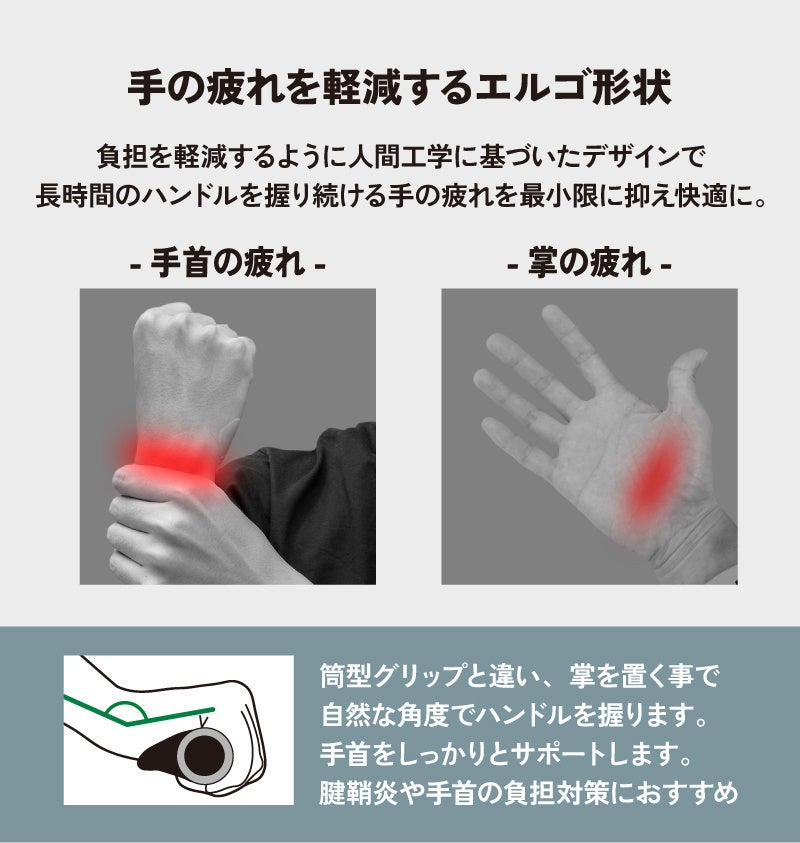 エルゴデザインで握りやすく疲れにくいグリップで、手首の疲れや、腱鞘炎で悩んでいる方におすすめです。