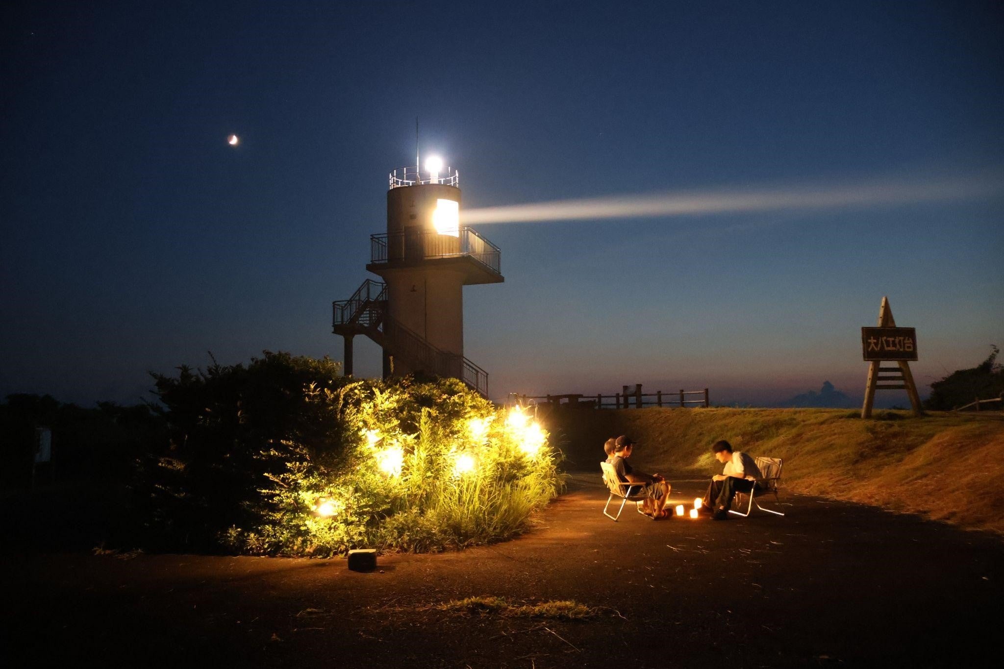 当日は、大バエ鼻灯台周辺を照明でライトアップするとともに、おしゃれな貸出チェアをご用意。日没は19時前なので、夕暮れ~夜の「マジックアワー」の空と海の雄大な景色や、灯台が点灯する瞬間、星空と灯台の灯りの競演など、バラエティに富んだ絶景をお楽しみいただけます。