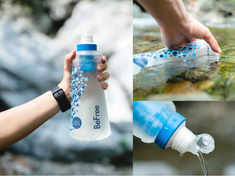 「一体型」でフィルターが内蔵されたキャップで構成されています。使い方は簡単、ボトル部分に水を汲んで、キャップを閉める。そのままボトル部分を押すように絞れば、99.9%の微生物やバクテリアが除去された安全な水を飲むことができます。