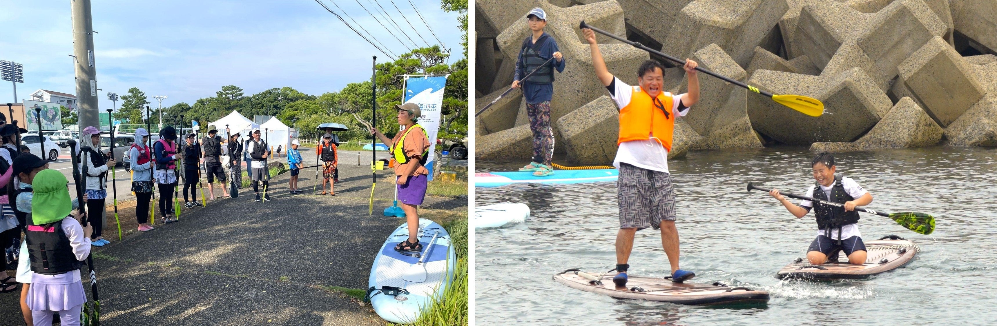 ごみ拾いで海周辺がきれいになったら、いよいよSUP体験のスタートです。まずは、陸でパドルの使い方を学び、インストラクターから「SUPに乗る人はパドルを使いこなすので『パドラー』と呼ばれます」と説明がありました。陸での講習を終えて、パドラーたちがSUPに乗り込みました。3日間、ほとんど波がなく大村湾はとても穏やかでした。SUP初体験の参加者も多くいましたが、穏やかな波のおかげか、みんなすぐに上達しスイスイと大村湾を進んでいきました。SUPで大村湾に出ることで、普段は見ることができない景色を楽しむこともできたようでした。