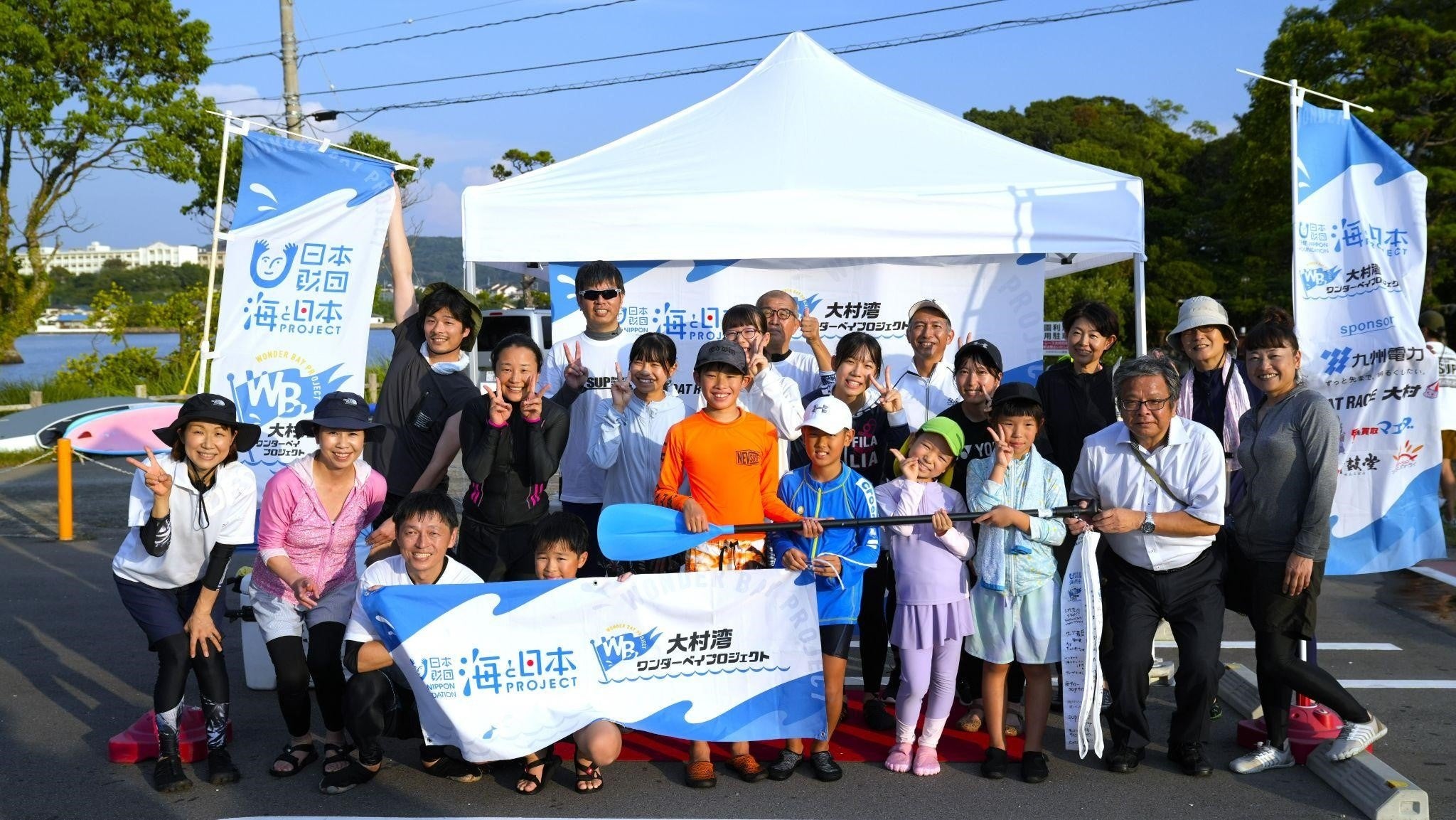 超閉鎖性海域と呼ばれる、国内でも有数の特徴がある大村湾。外側の海から影響を受けにくく、大村湾の環境問題は、大村湾流域の5市5町の生活環境が大きく影響します。そのため、5市5町の企業・自治体・地域住民がワンチームとなって、豊かな大村湾を守るアクションを起こすことがとても重要です。その第一歩になるのが、このイベント「Wonder Bay Challenge2024 in大村湾」です。SUPを通して大村湾を身近に感じ、大村湾を守っていくためのアクションに繋げることを目的として、大村湾を囲む市町8か所でのSUP体験イベントを、タスキリレー形式で開催しました。