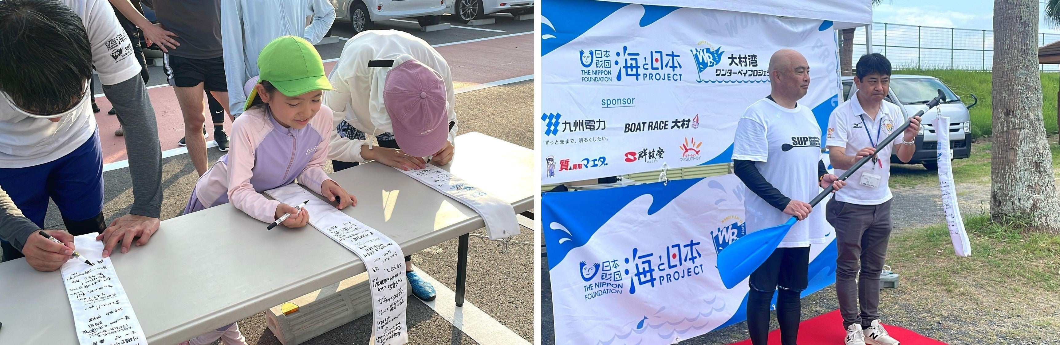 90分間SUPを楽しんだ参加者たち。みんな「楽しかった!」と笑顔で陸に戻ってきました。戻ってきた参加者から順番に、タスキにメッセージを書き込んでもらいます。「大村湾最高!」「もっと大村湾について知りたい!」「海を守る!」「きれいな海を未来に!」「SUP楽しかった!」など思い思いに綴り、イベント終了時には、3本のタスキがメッセージでいっぱいになりました。