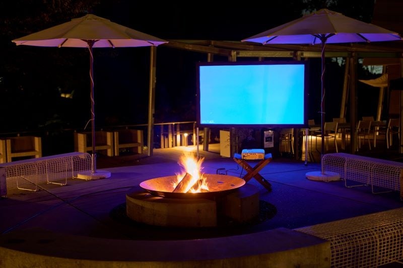 焚火ガーデンにスクリーンを設置し、心地よい秋の夜風の中で、焚火の温かさを感じながら映画をお楽しみいただけます。ご宿泊のお客さま限定で、無料でお楽しみいただけます。