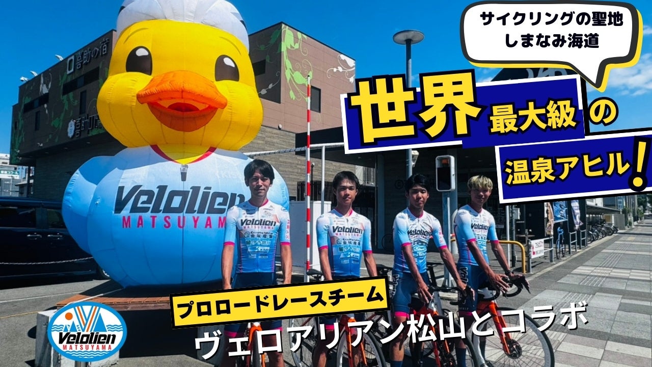 今年の大会に合わせて、キスケ株式会社では、サイクリストに新たな楽しみを提供するため、地元の自転車ロードレースチーム「ヴェロリアン松山」とコラボレーションし、特別な温泉アヒルを製作しました。この温泉アヒルは全長3mの大きさを誇り、ヴェロリアン松山の公式ユニフォームを着用した、世界に1体だけのサイクリング仕様です。温泉アヒルを「しまなみ海道」の新たな観光スポットとして、訪れる多くの方々に楽しんでいただきたいと考えています。