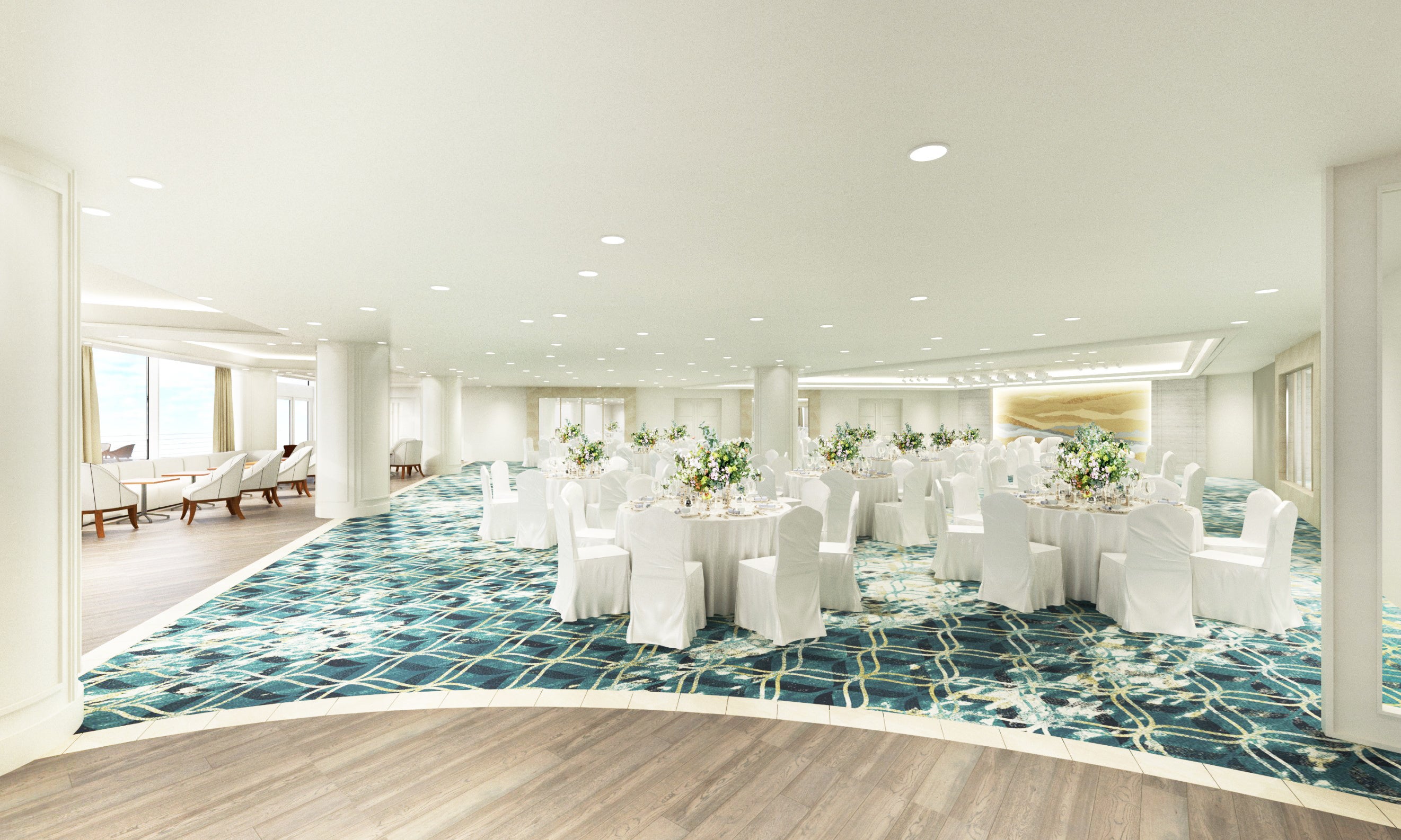 今回のリニューアルでは、白壁を基調としたエレガントな室内を、優しくゆらぐ水面を想起させるブルーグリーンの絨毯や、波の綾をイメージした左官仕上げのアートウォールなど「平和な、穏やかな」というパシフィックの語源に着想を得たインテリアでコーディネートし、海外リゾートのような自由で高級感溢れる空間に仕上げました。