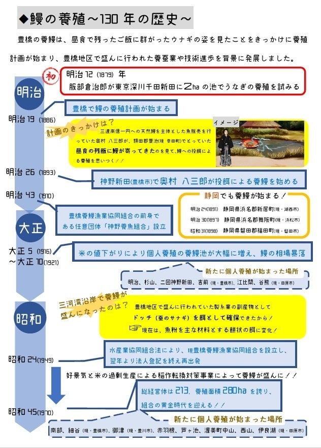 豊橋の養鰻は130 年近くの歴史があり、実はあの一色町(現在の西尾市)よりも早く始まりました。