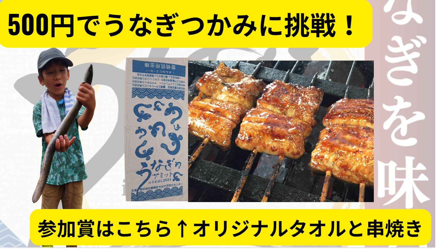 500円で魚つかみならぬ、うなぎつかみに挑戦してみませんか!?大きなプールなので、お子さまでも安心して挑戦できるのが◎。参加者には豊橋産うなぎの串焼きとオリジナルタオルの豪華プレゼントつき!