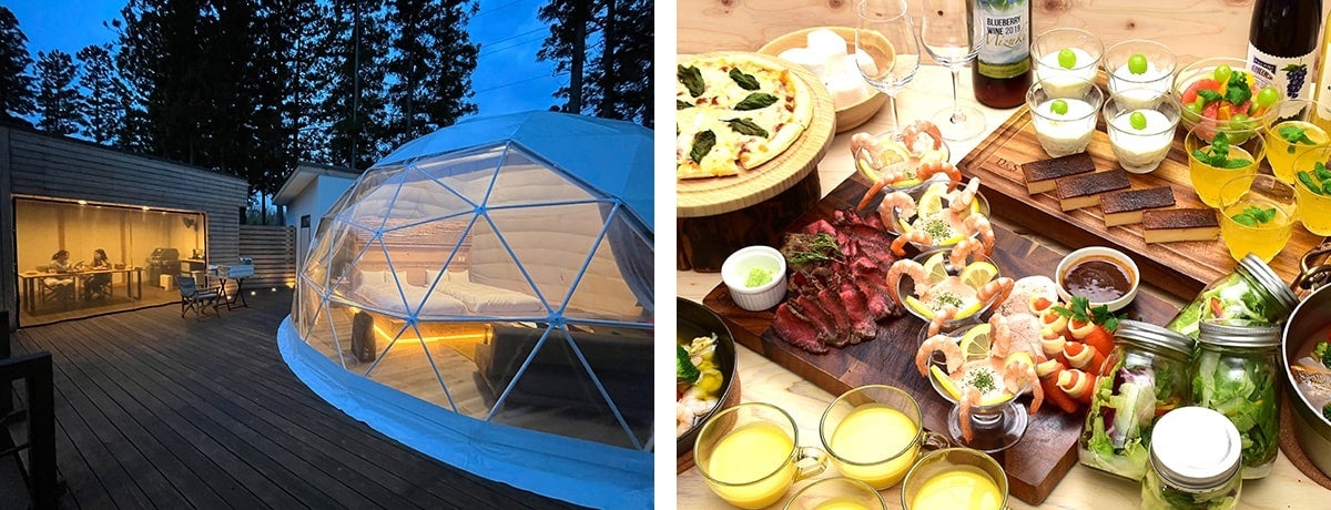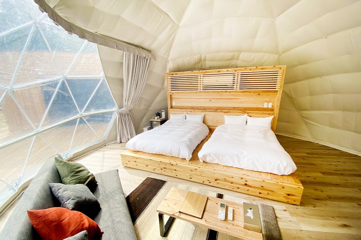木々に囲まれたプライベート空間に5つの広々としたドーム型テントを設置。シャワー&トイレ併設で冷暖房