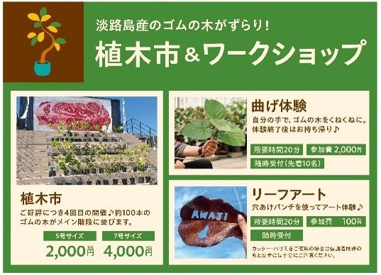 また淡路島産のゴムの木各種・サイズがずらり勢揃いの「植木市&ワークショップ」も好評をいただいているものをスケールアップしての開催です。