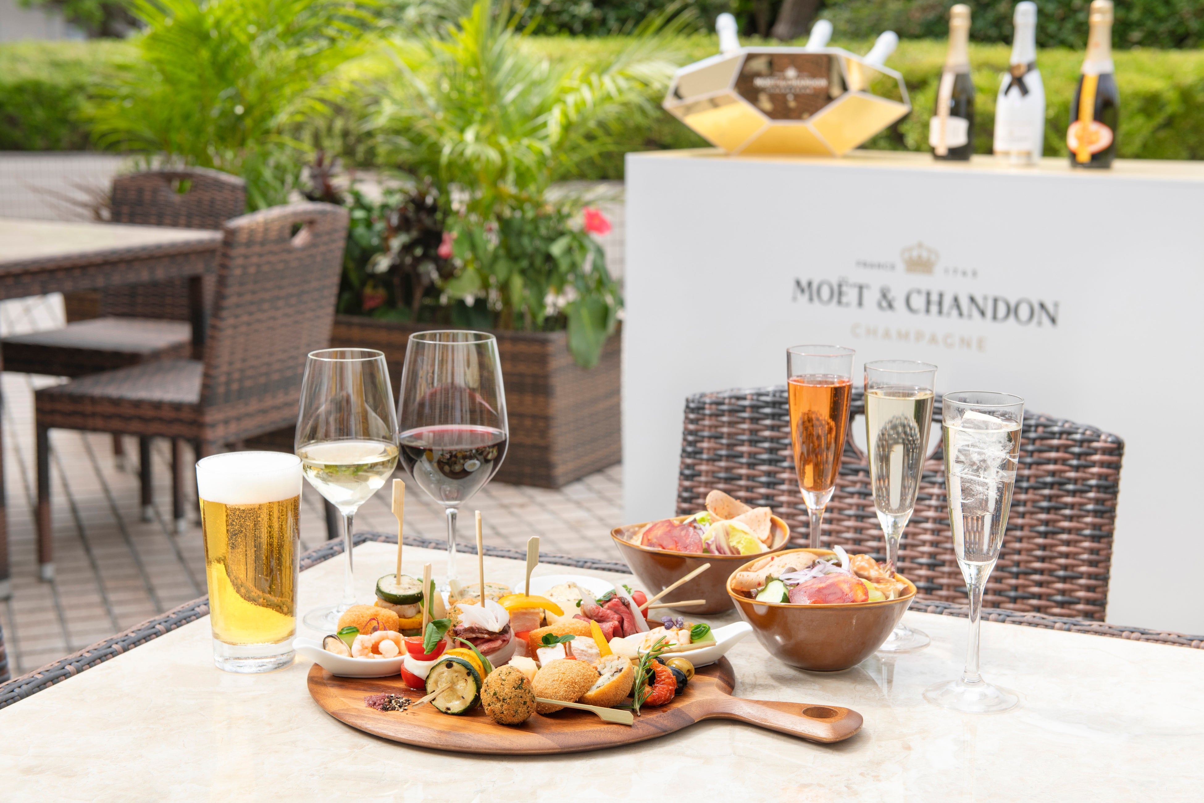シェフこだわりのメニューを盛り付けたプレートには、イタリア産パルミジャーノ・レッジャーノから切り出したパルメザンチーズキューブをはじめ、水牛の乳から作るブッファラ・ボッコンチーニを使ったカプレーゼなど、ワインにぴったりなチーズメニューを豊富にセレクト。また、ロティサリーオーブンで焼き上げたローストビーフや、低温調理でしっとりと仕上げた鶏むね肉を使った一品など、グリル&イタリアン「アチェンド」で人気の前菜から厳選したメニューもお楽しみいただけます。また、フリーフローのドリンクは、スタンダードとプレミアムの2種類のプランをご用意しております。プレミアムプランでは、スタンダードプランのドリンクメニューに加えて、シャルドネとピノ・ノワールの美しいブレンドによる、フレッシュシトラスの様なピュアな果実味が爽快なスパークリングワイン「シャンドン ブリュット」が飲み放題に。さらに乾杯ドリンクとして、氷を入れて完成する至福の味わいのシャンパーニュ「モエ・エ・シャンドン アイス アンぺリアル」か、暑い夏にぴったりな爽やかな甘みが特徴の「シャンドン ガーデン スプリッツ」のどちらかをお選びいただけます。